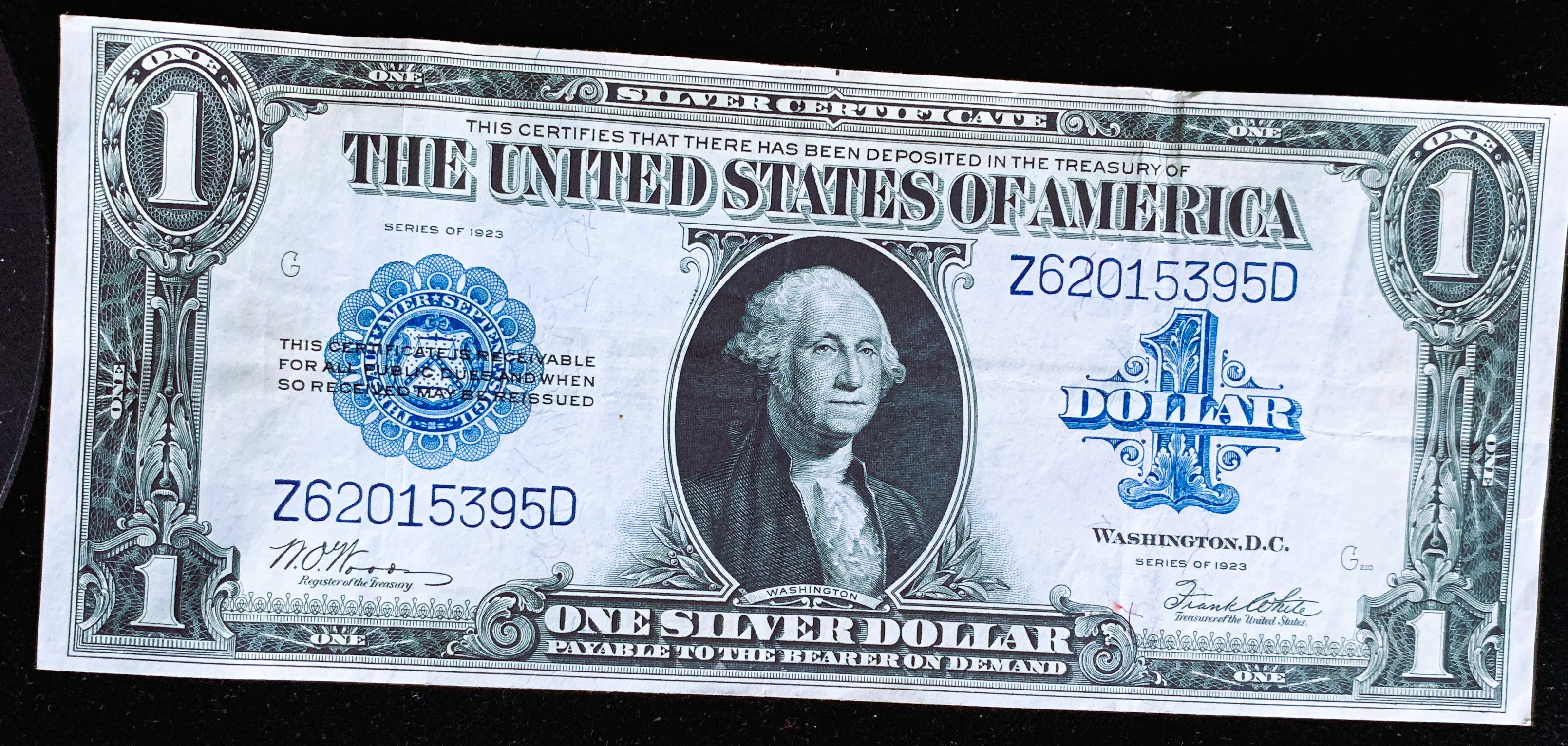 1923 SERIES VINTAGE U.S. LARGE SIZE $1 DOLLAR SILVER CERTIFICATE NOTE, RARE CRISP REALLY NICE CONDITION, CLASSIC BLUE SEAL IN SLEVE, PAPER MONEY & COINS