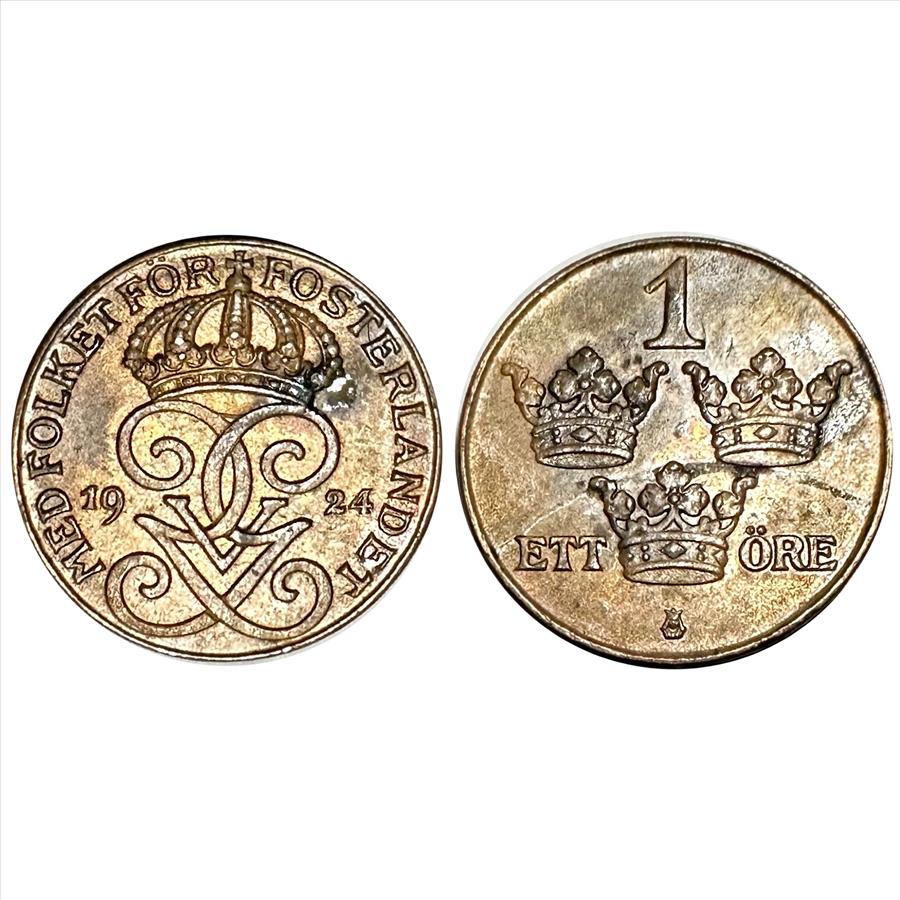 >1924 Sweden 1 Ore Coin - Crowned Double Monogram of King Gustaf V and 1877 2 Ore Coin, "Welfare of the Brotherhood"
