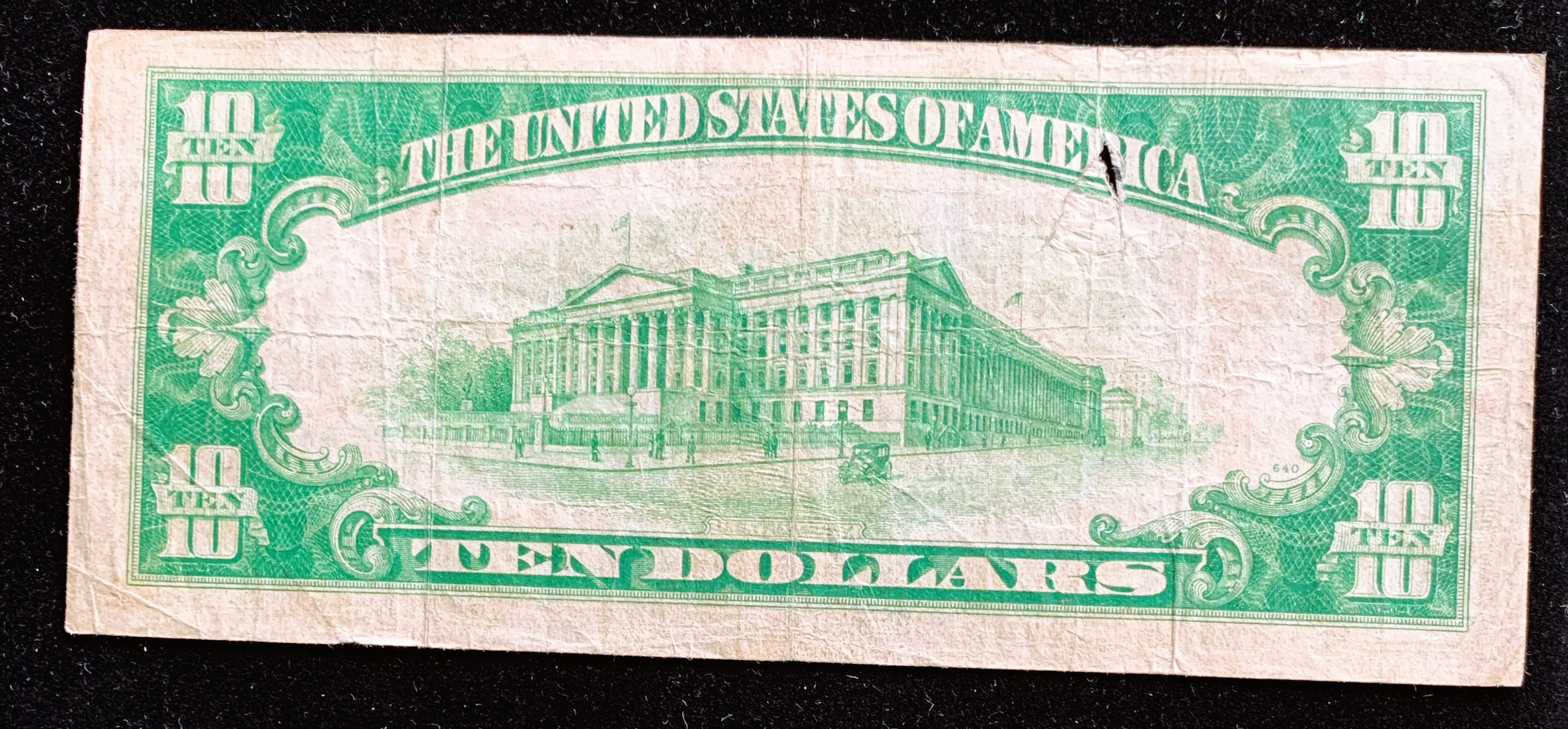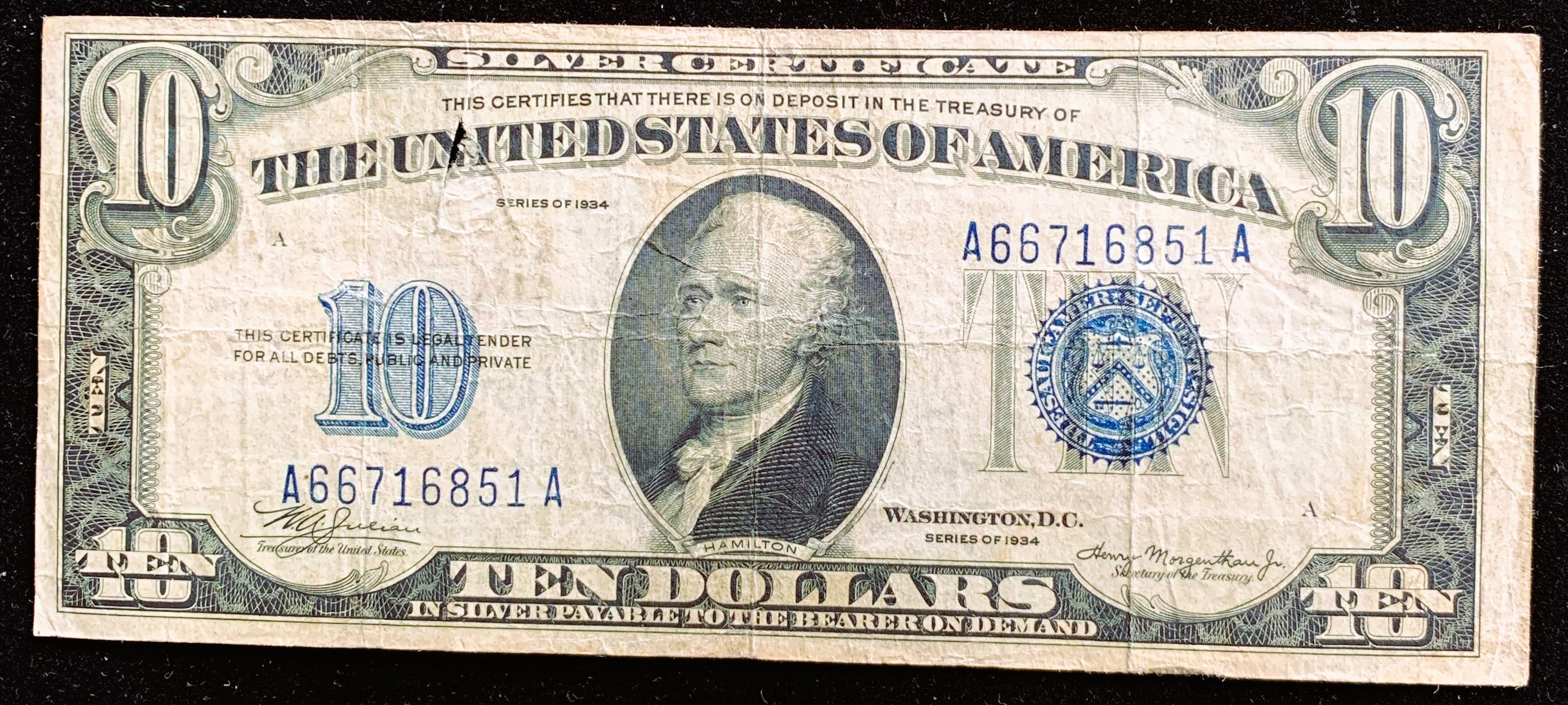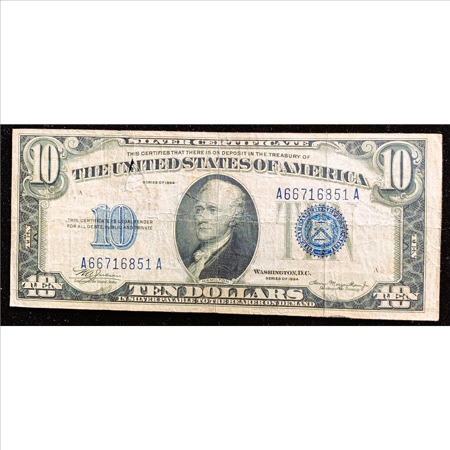 1934 SERIES $10 DOLLAR SILVER CERTIFICATE, LARGE BLUE SEAL, SMALL HOLE ABOVE N IN UNITED