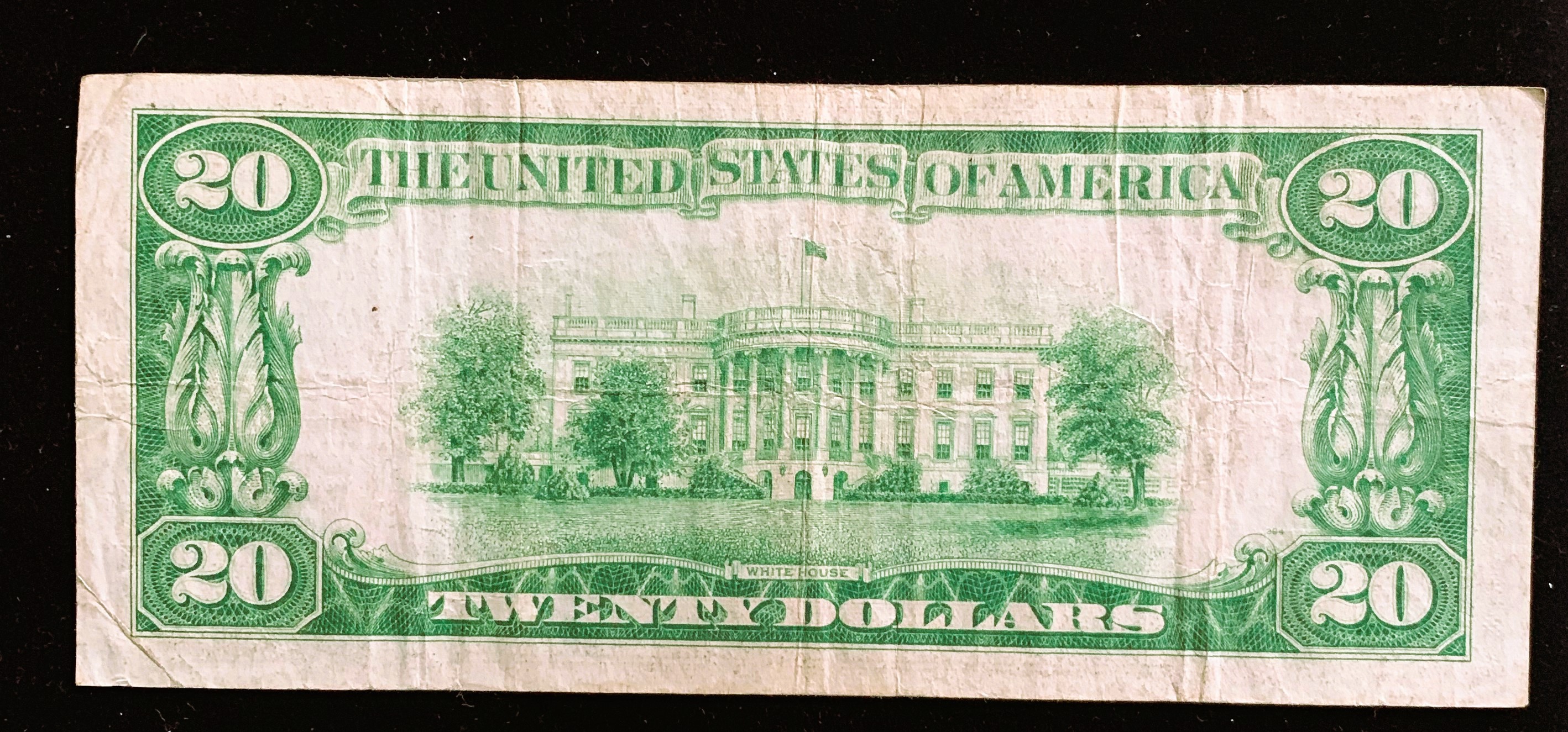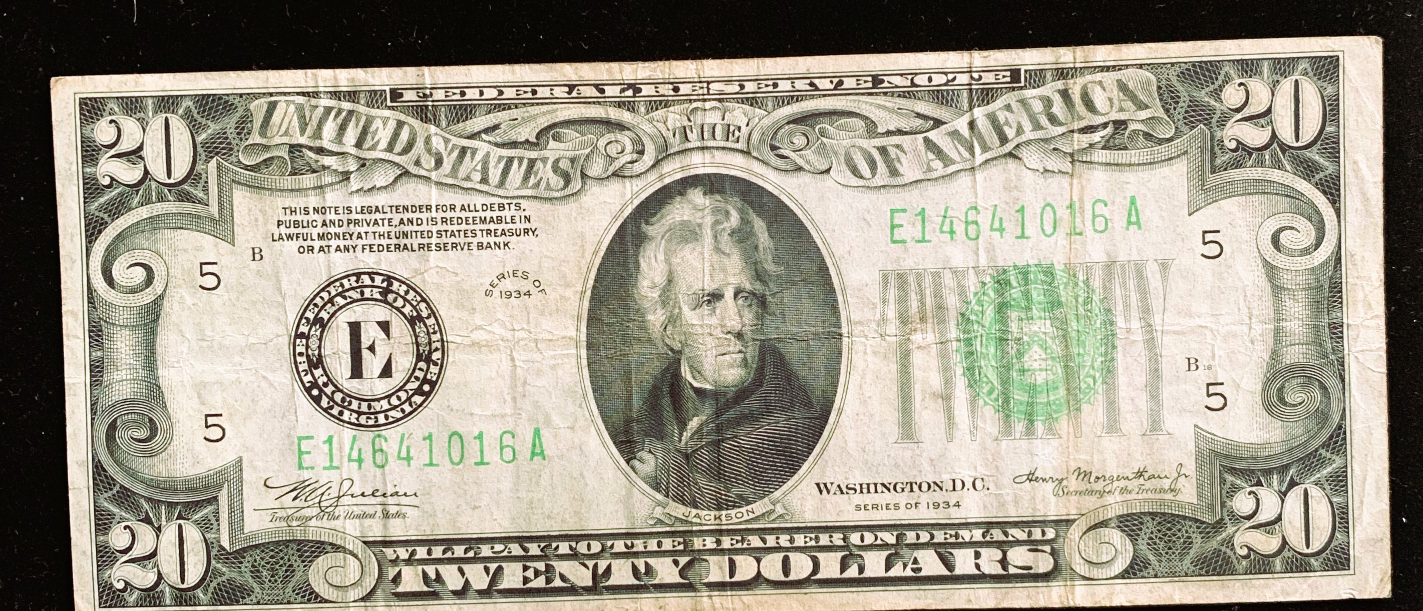 1934 SERIES $20 DOLLAR FEDERAL RESERVE NOTE. GREEN SEAL, RICHMOND VIRGINIA, AU NICE IN SLEVE
