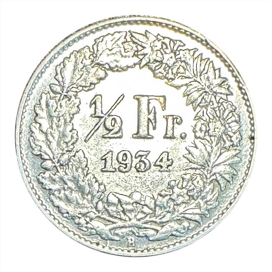 >1934B Switzerland Silver 1/2 Franc Helvetia Coin - Excellent Detail