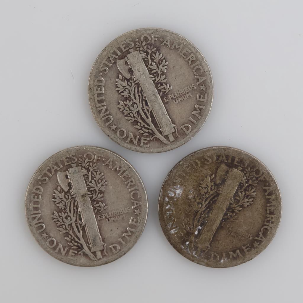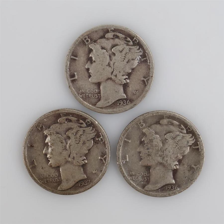 1936 & 1937 US Mercury Silver Dimes, 3 Pieces