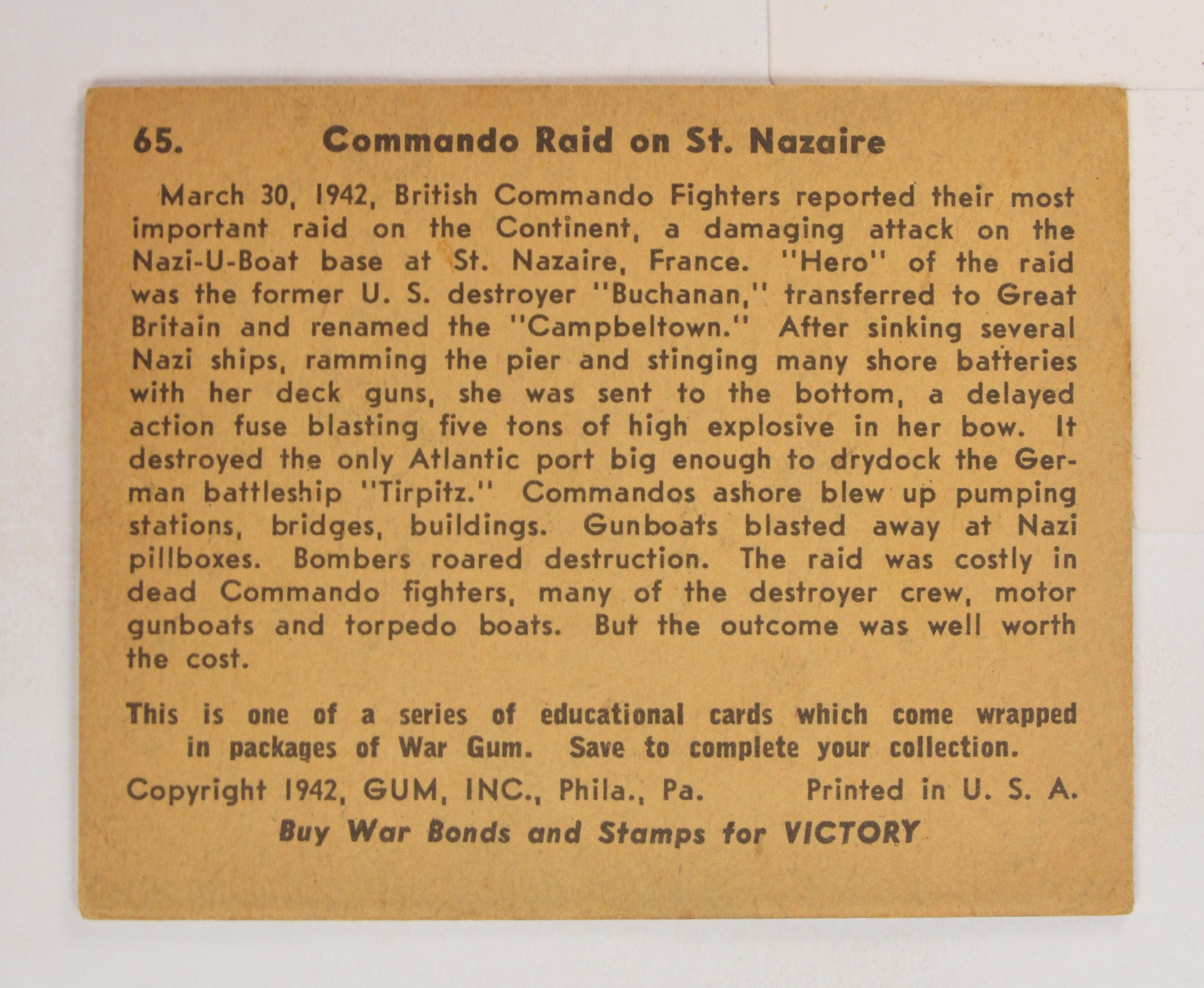 1941 Commando Raid On St. Nazaire #65 War Gum Collectors Card