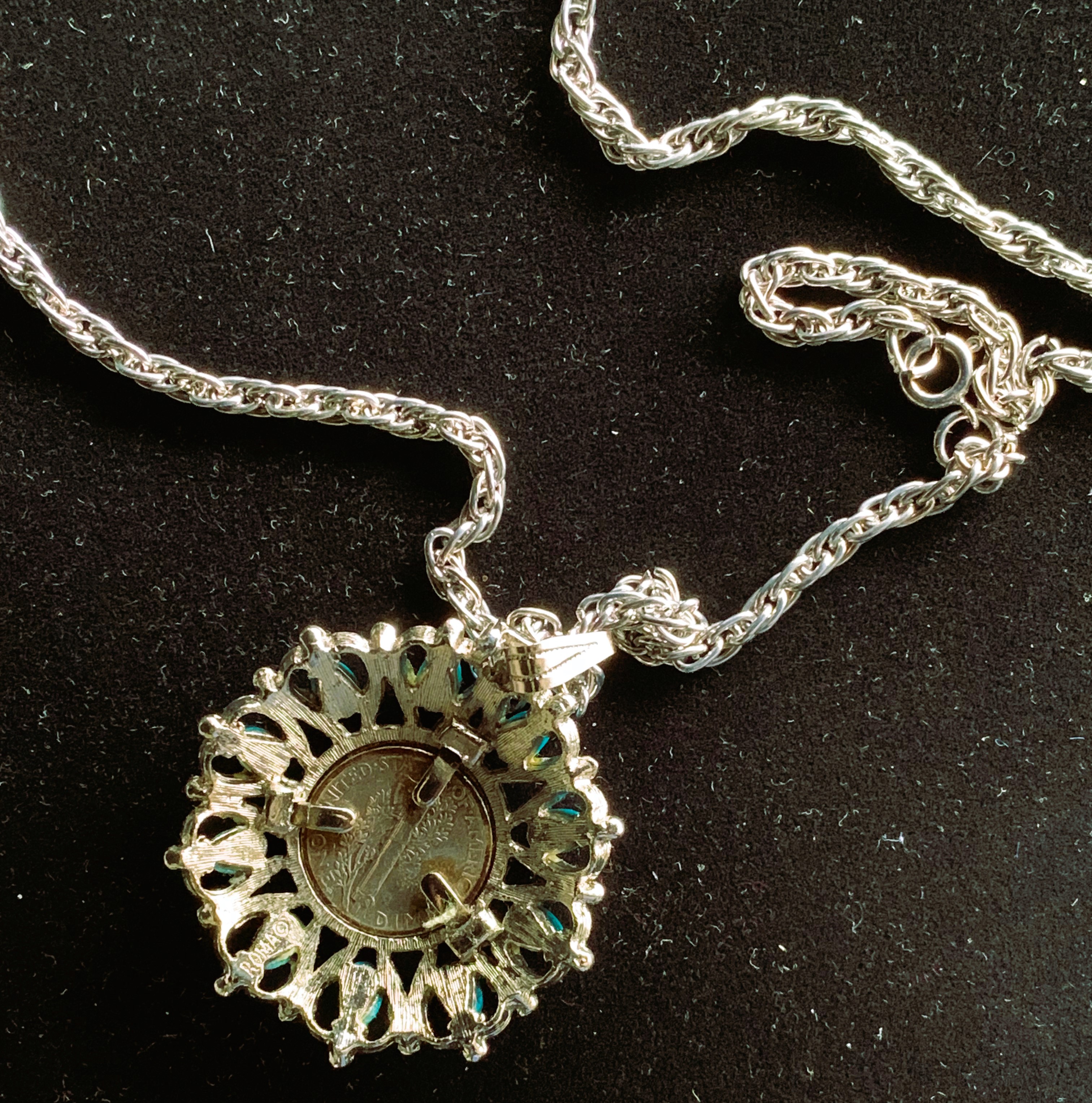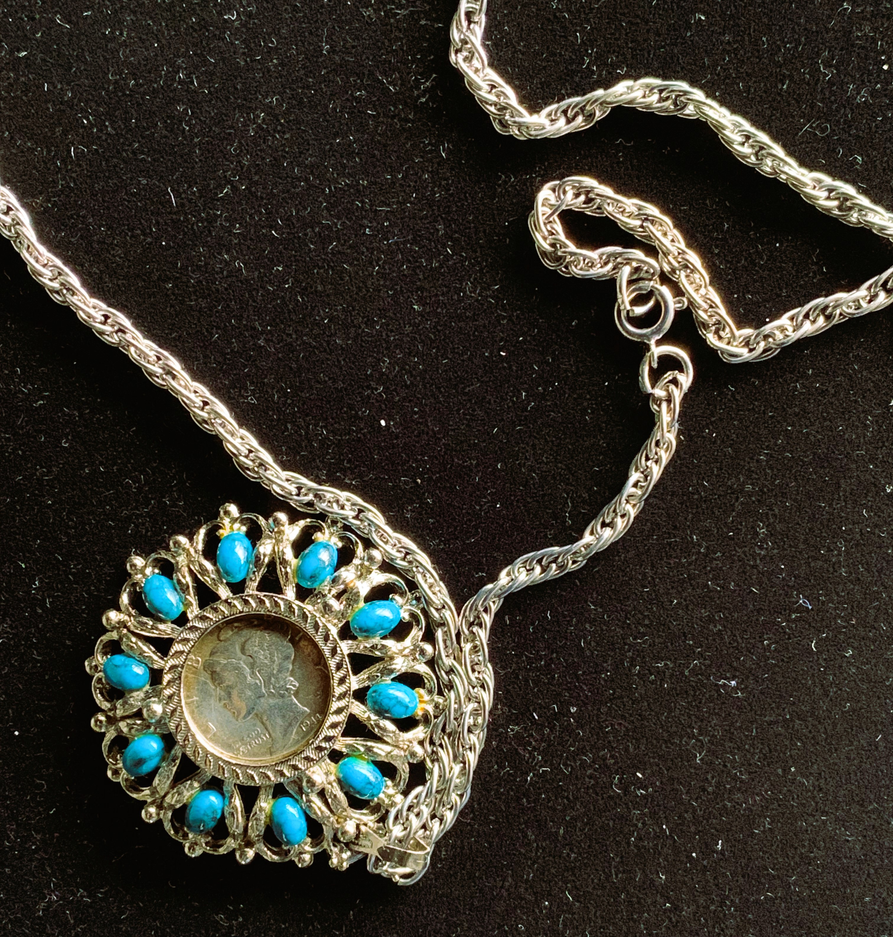 1944 SILVER MERCURY DIME COIN IN JEWELRY BEZEL SURROUNDED WITH TURQUOISE STONES, WITH 24" CHAIN
