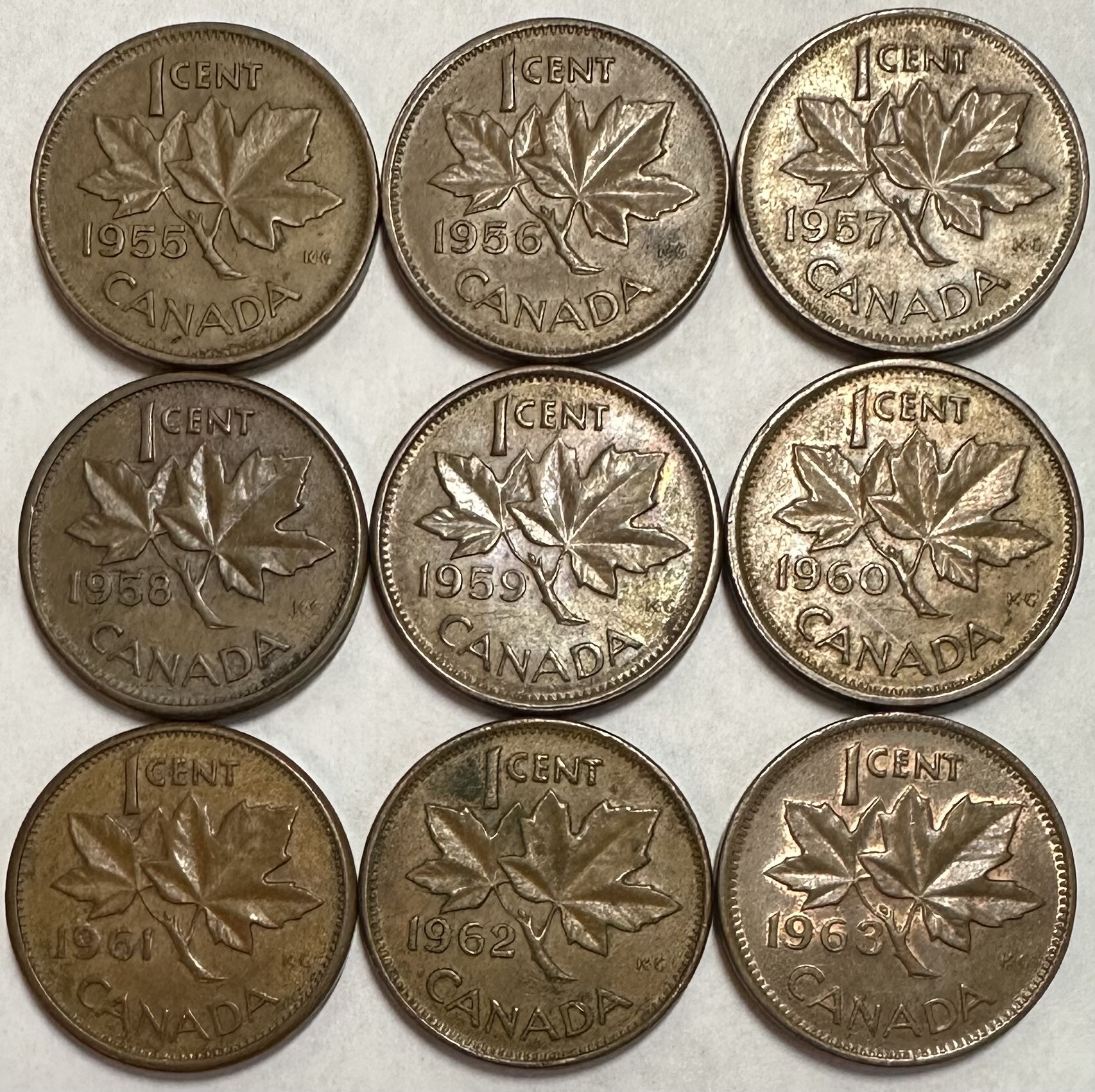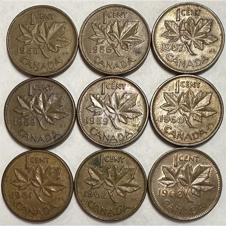 >1955-1963 Canada 1 Cent Coins - Nice Set of 9 Sequentially Dated Coins!