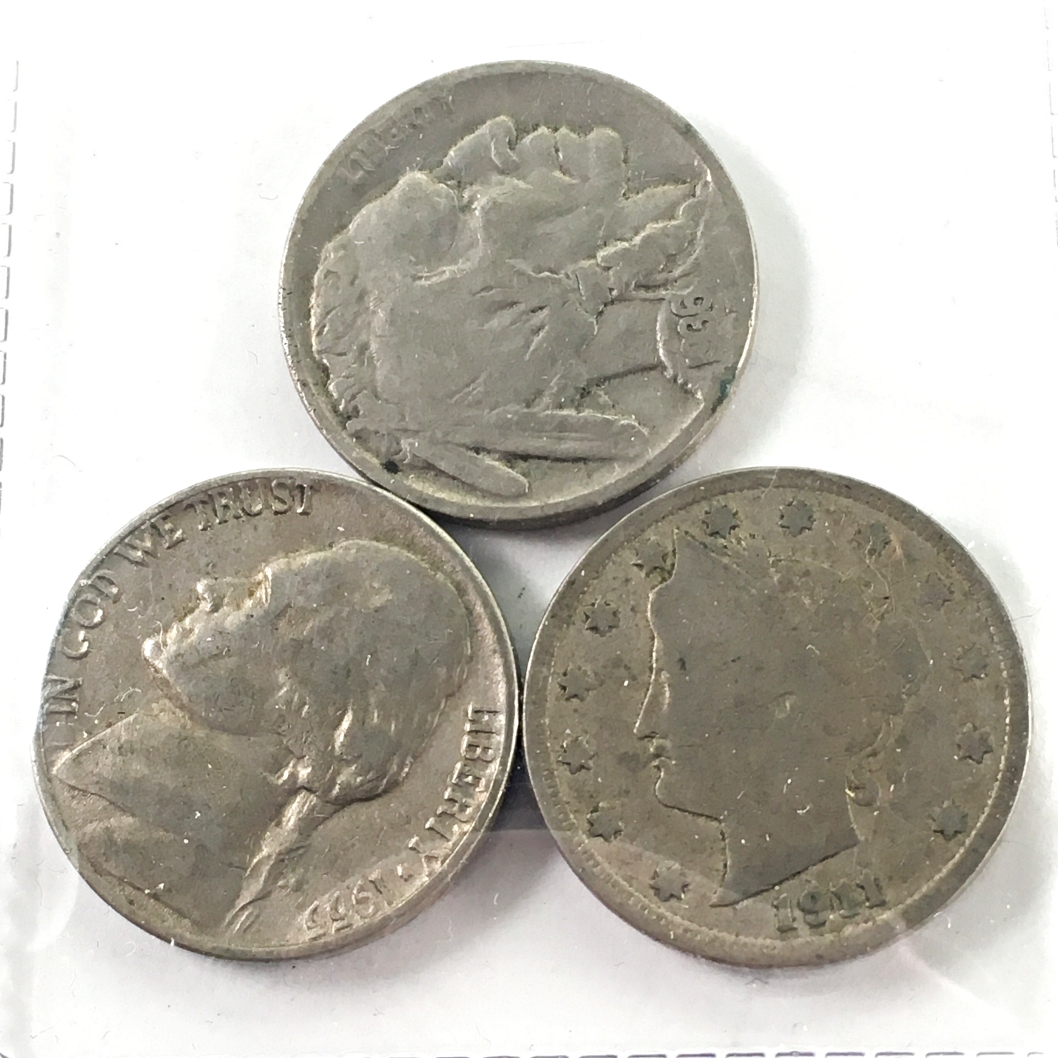 1955-D Jefferson Nickel, 1936 Buffalo Nickel and 1911 Liberty Head "V" Nickel