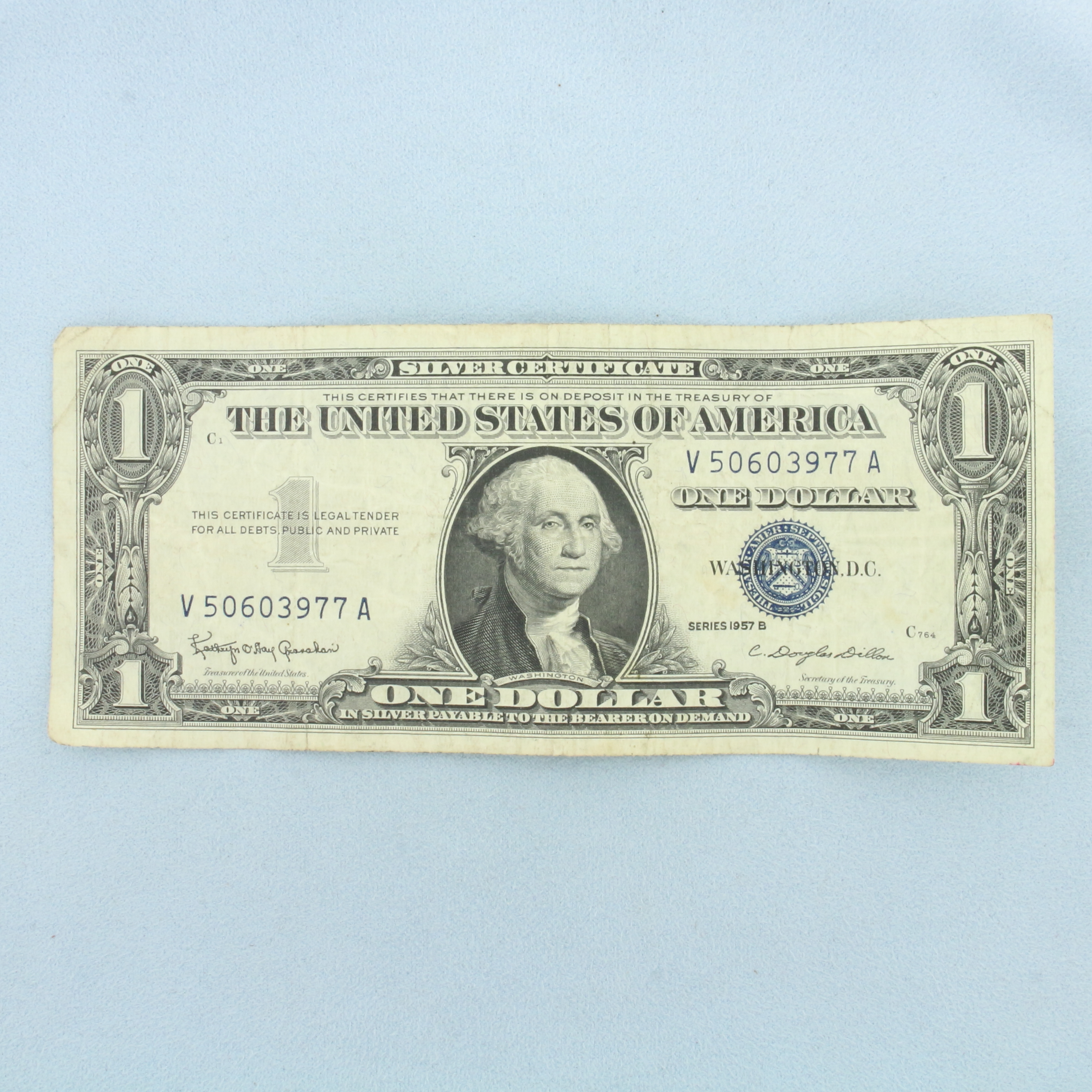 $1 One Dollar Silver Certificate banknote with a blue seal, circulated condition. No rips or tears on note, typical circulated condition.