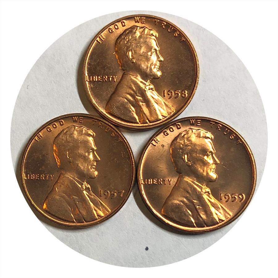 >1957 & 1958 U.S. Lincoln Wheat Cents & 1959 Lincoln Memorial Cent - Brilliant Uncirculated - 3 Coins
