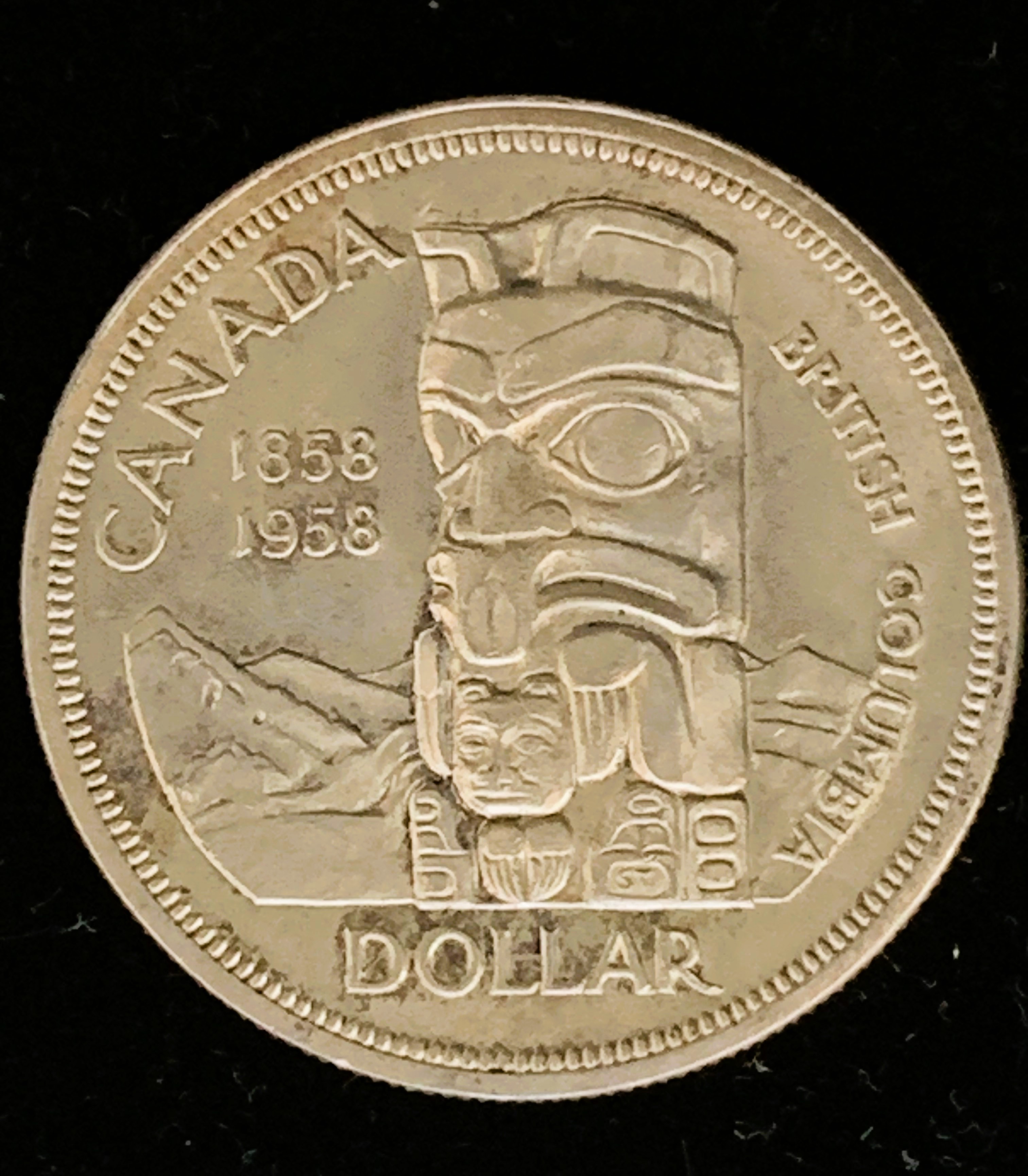 1958 CANADIAN SILVER DOLLAR, 100 YEAR COMMEMORATIVE OF BRITISH COLUMBIA LOTS OF DETAIL , SOME TONING, NICE COIN