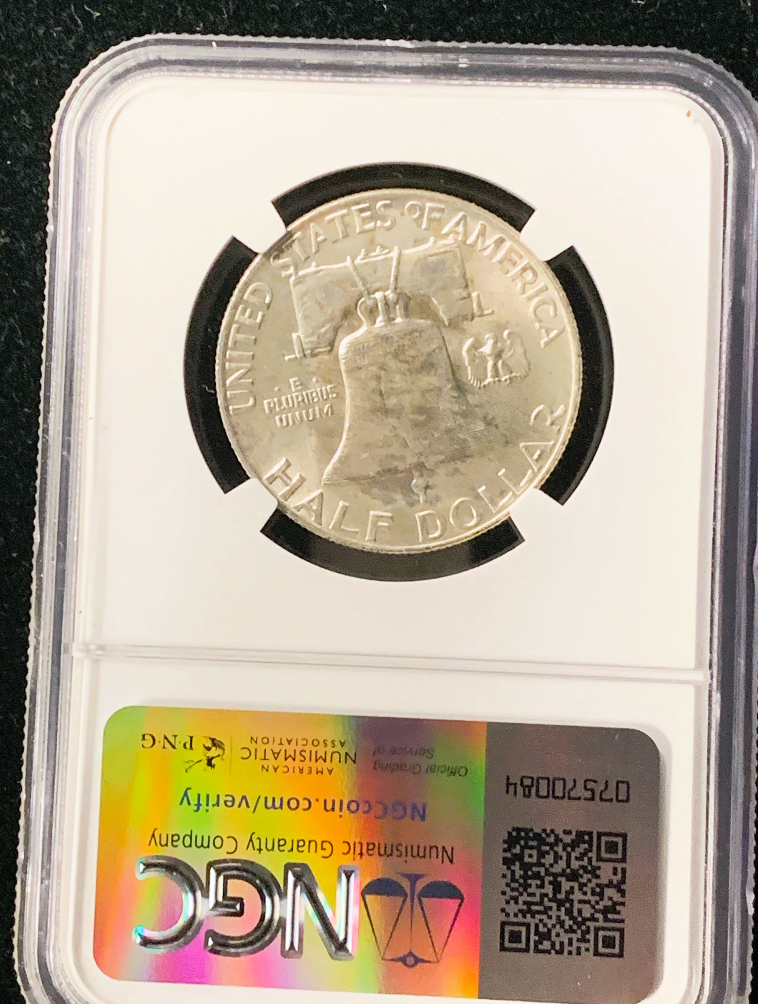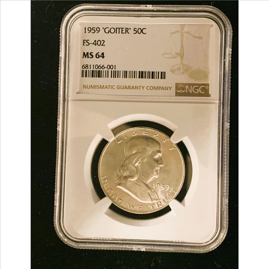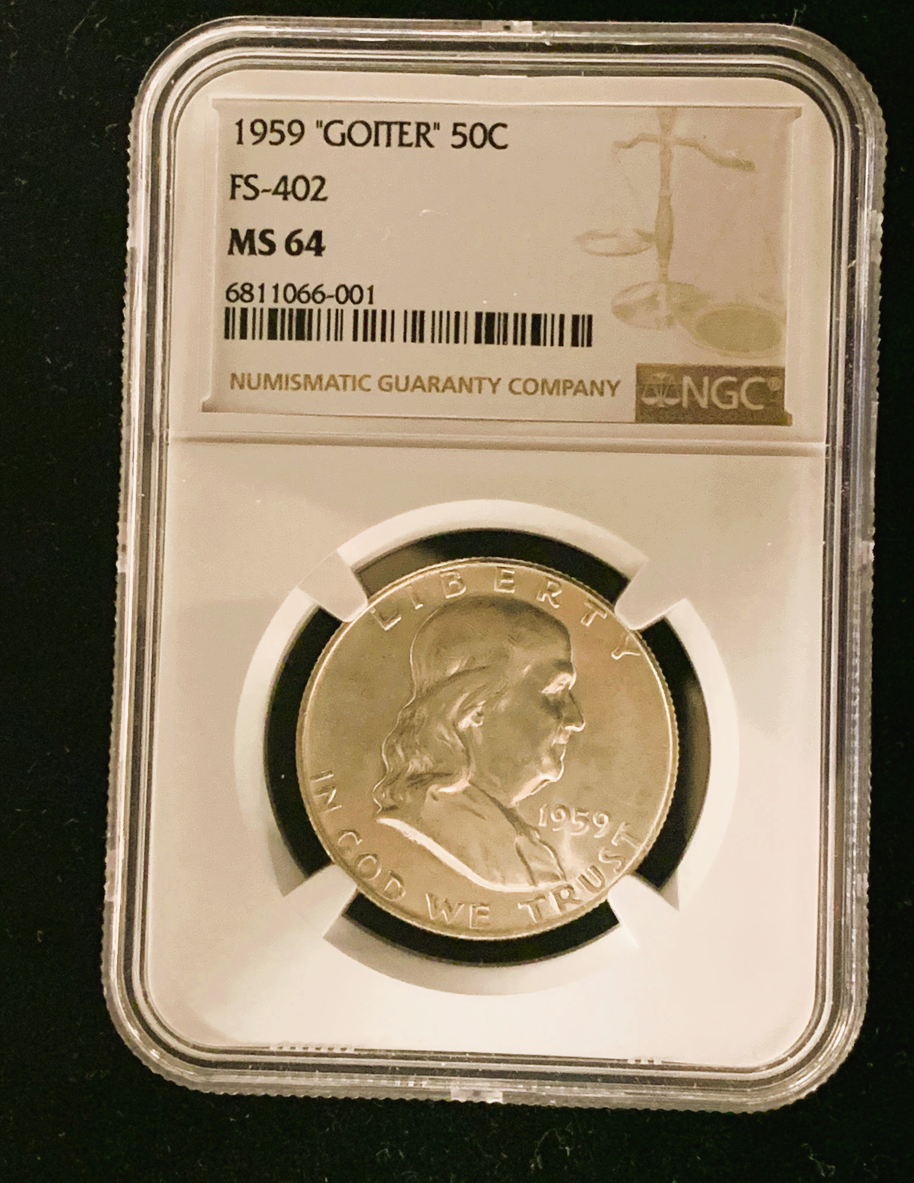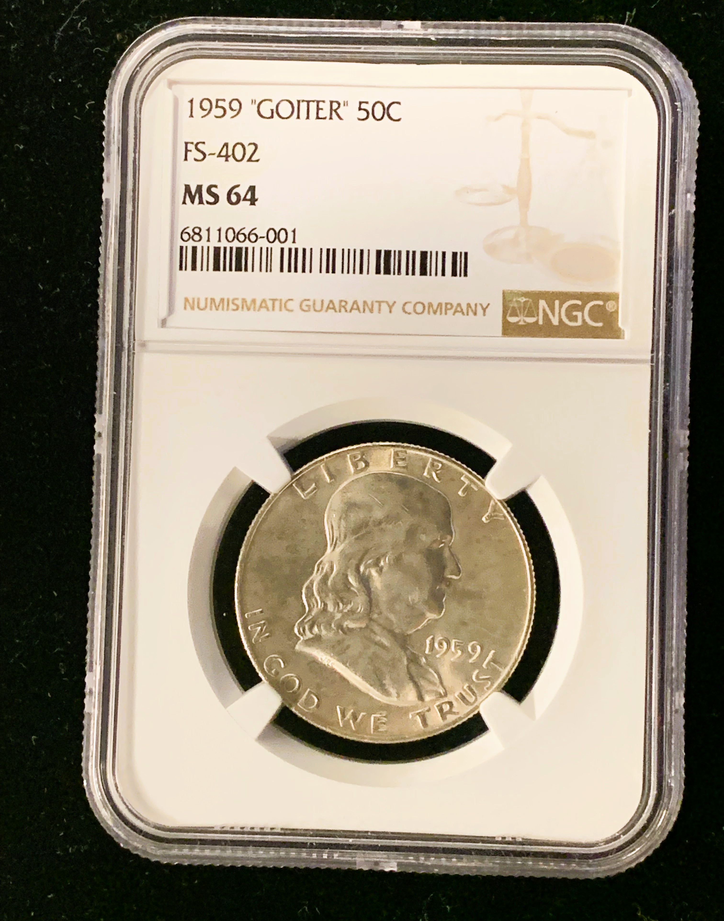 1959 "GOITER" 50C NGC GRADED MS 64, FS-402, HIGH GRADE RARE LUSTROUS SHINY GEM COIN, IN THE SLAB