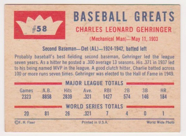 1960 Fleer Charlie Gehringer #58 Card - HOF'er
