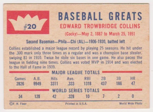 1960 Fleer Eddie Collins #20 Card - HOF'er
