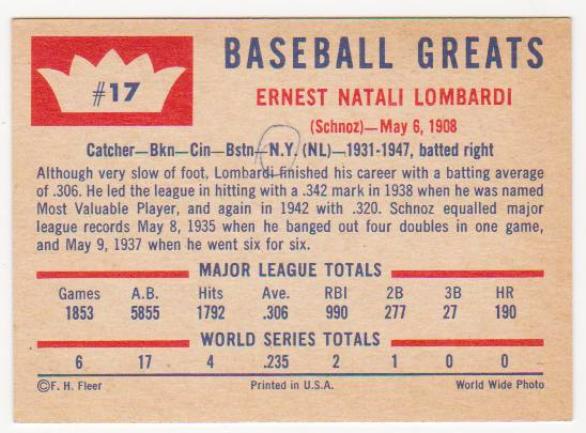 1960 Fleer Ernie Lombardi #17 Card - HOF'er
