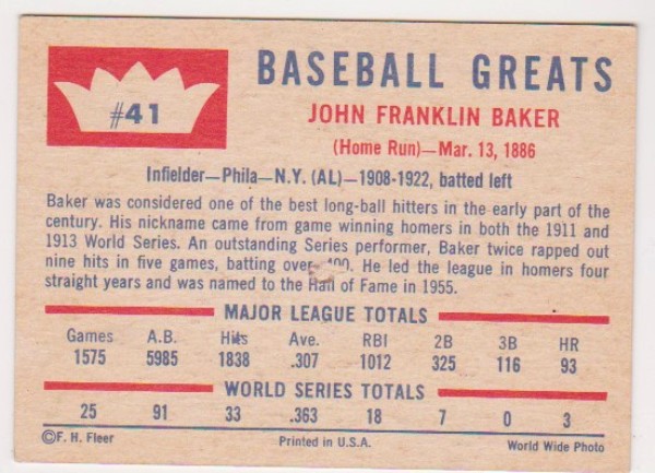 1960 Fleer Frank "Home Run" Baker #41 Card - HOF'er