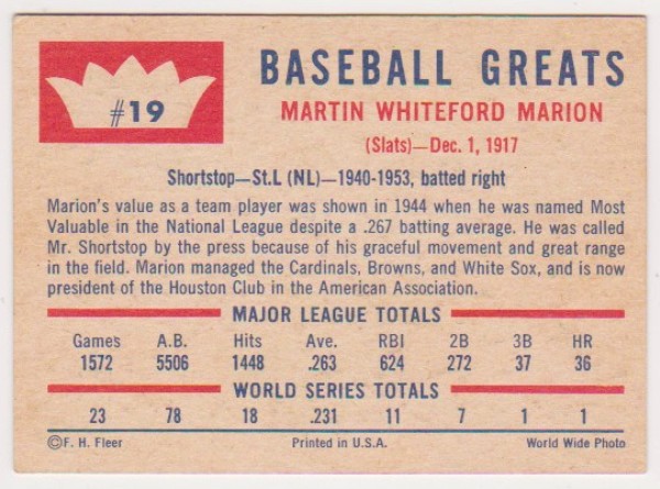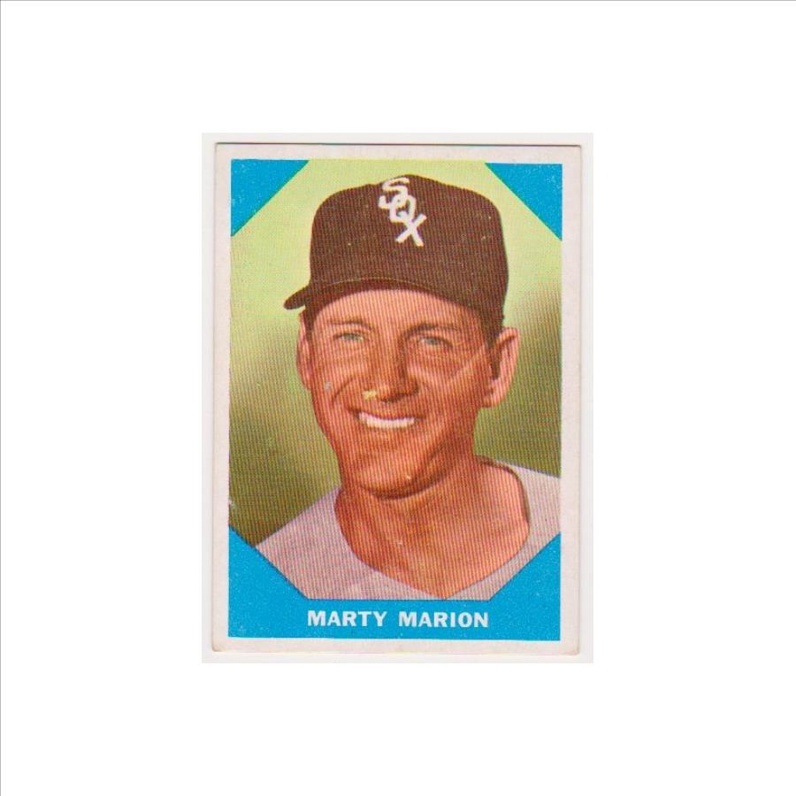 This is an authentic 1960 Fleer Marty Marion #19 card.  This one is in approximately VG-EX to EX condition. It has some corner/surface wear and is a little off center, but overall displays pretty well in a holder. This is an original 65 year old card.