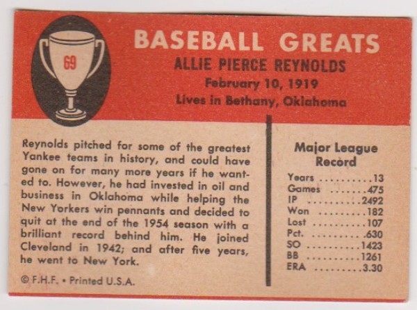 1961 Fleer Allie Reynolds #69 Card - New York Yankees