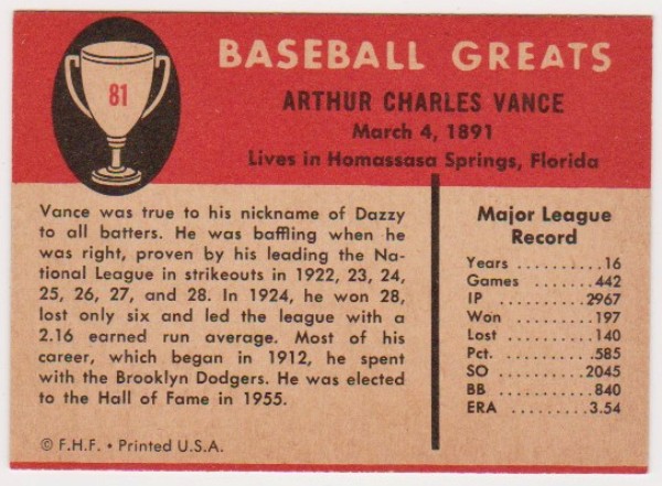 1961 Fleer Dazzy Vance #81 Card - HOF'er