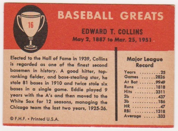 1961 Fleer Eddie Collins #16 Card - HOF'er