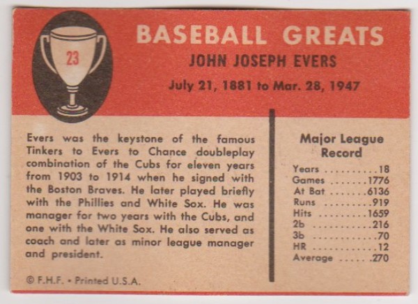 1961 Fleer Johnny Evers #23 Card - HOF'er