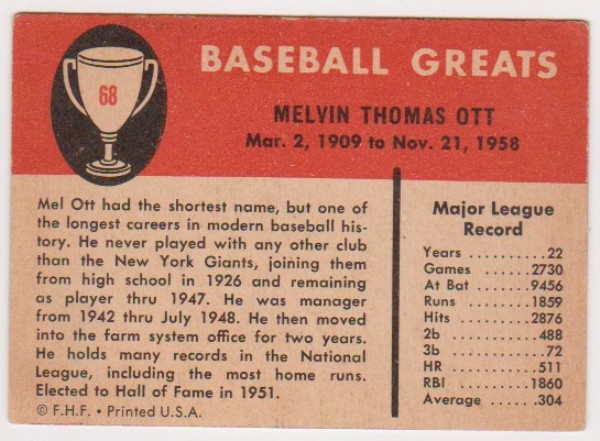 1961 Fleer Mel Ott #68 Card - HOF'er