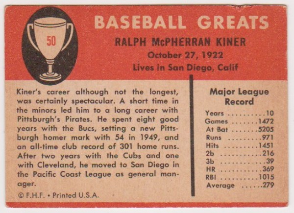 1961 Fleer Ralph Kiner #50 Card - HOF'er