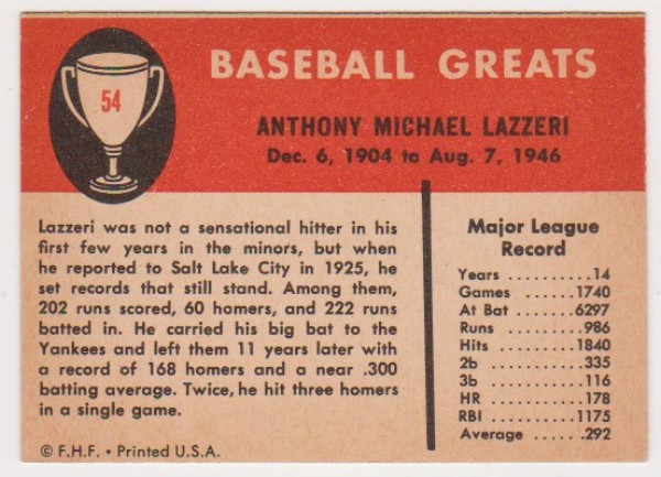 1961 Fleer Tony Lazzeri #54 Card - HOF'er