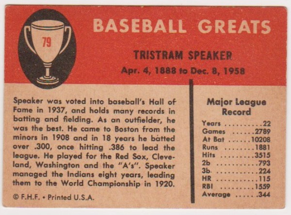 1961 Fleer Tris Speaker #79 Card - HOF'er
