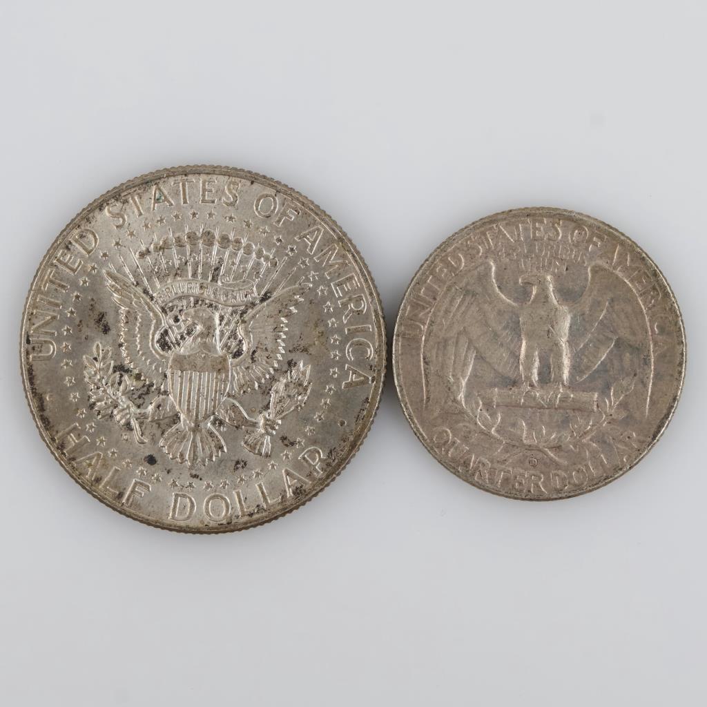1963-D US Washington Silver Quarter And 1964-D Kennedy Silver Half Dollar, 2 Pieces