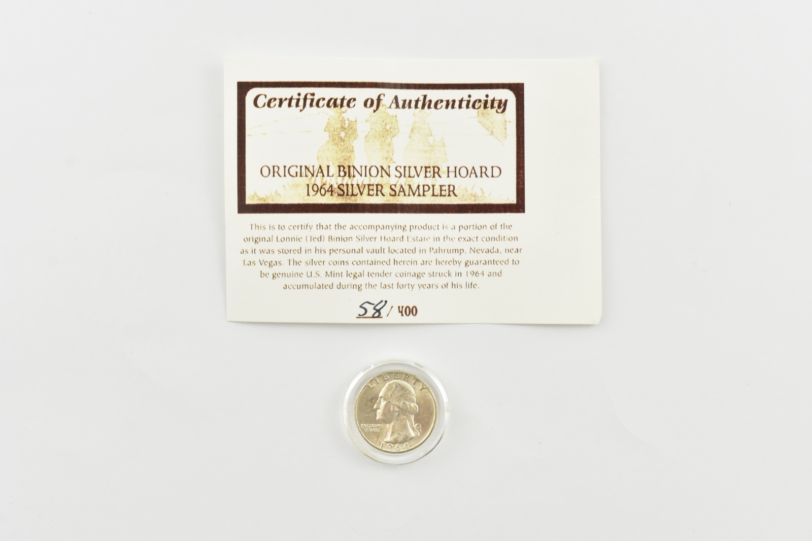 1964-D Washington Quarter Original Binion Silver Hoard Sampler 58/400 COA