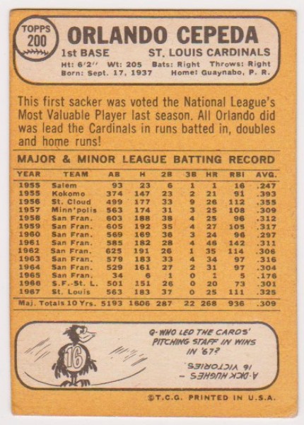 1968 Topps Orlando Cepeda #200 Card - HOF'er