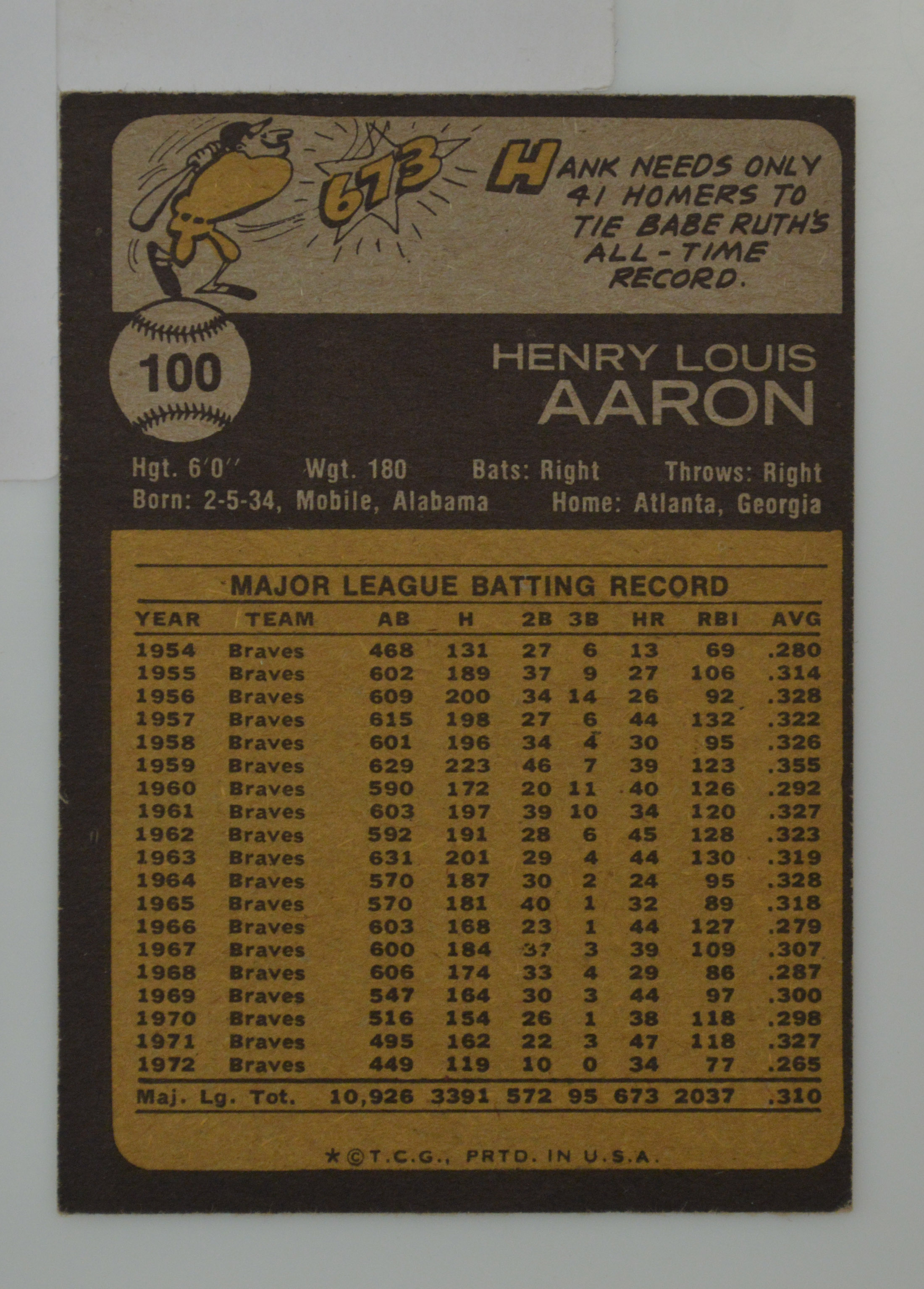 1969 Hank Aaron Atlanta Braves Topps #100- Book Value $40