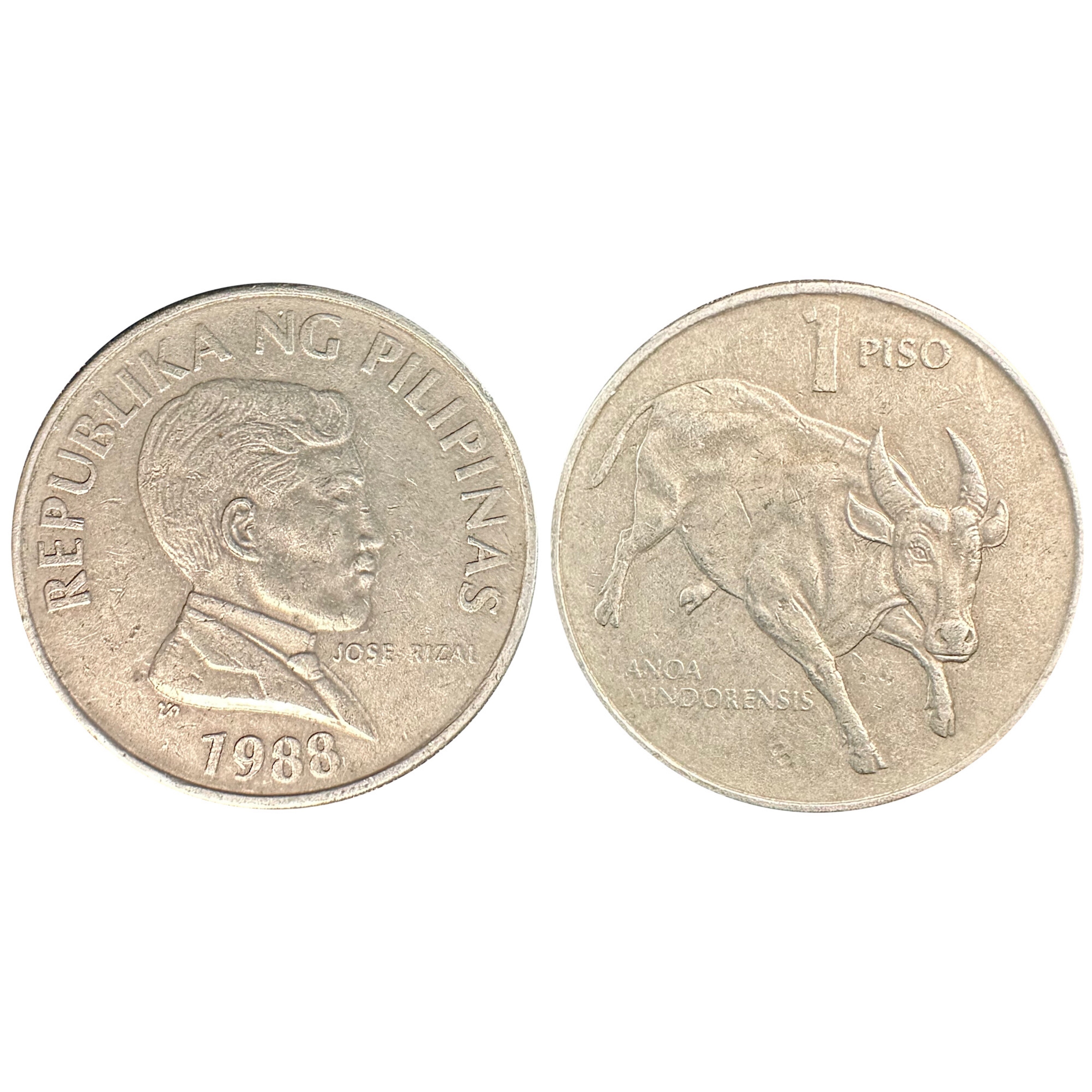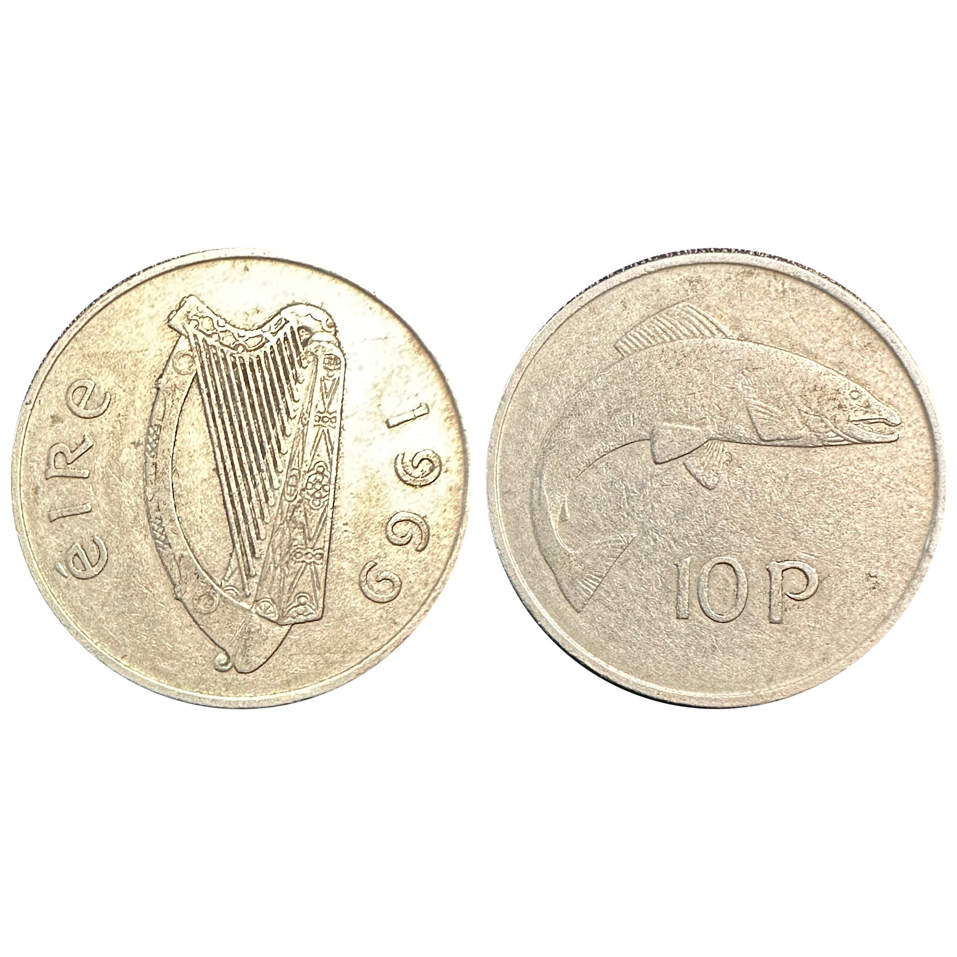 >1969 Ireland Eire 10 Pence (Salmon) and 1988 Philippines Jose Rizal 1 Piso Coins - 2 Coins