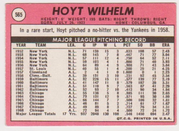 1969 Topps Hoyt Wilhelm #565 Card - HOF'er