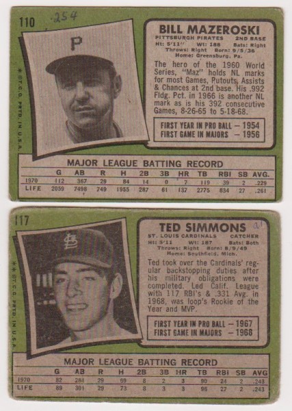 1971 Topps Bill Mazeroski #110 + Ted Simmons #117 Card Pair - HOF'ers