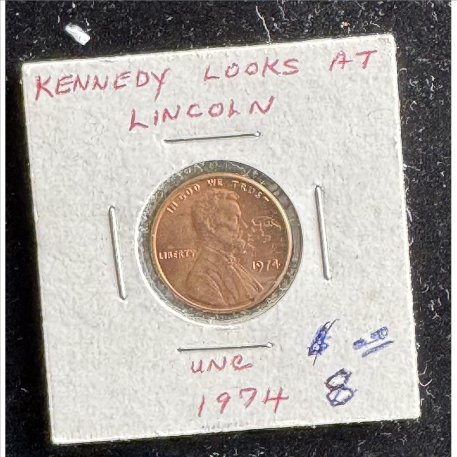 1974 KENNEDY LOOKING AT LINCOLN 1 CENT UNC COIN