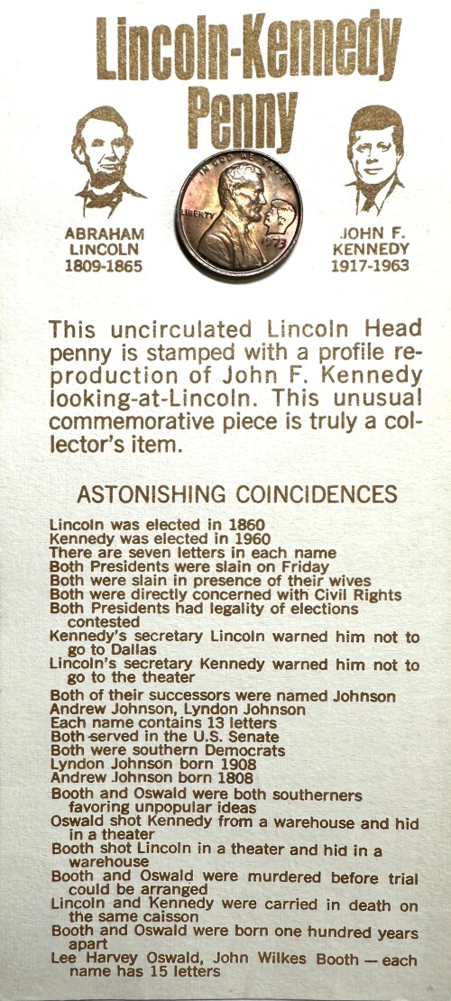 1974 Lincoln-Kennedy Penny - Stamped with a Profile Reproduction of John F. Kennedy Looking at Lincoln
