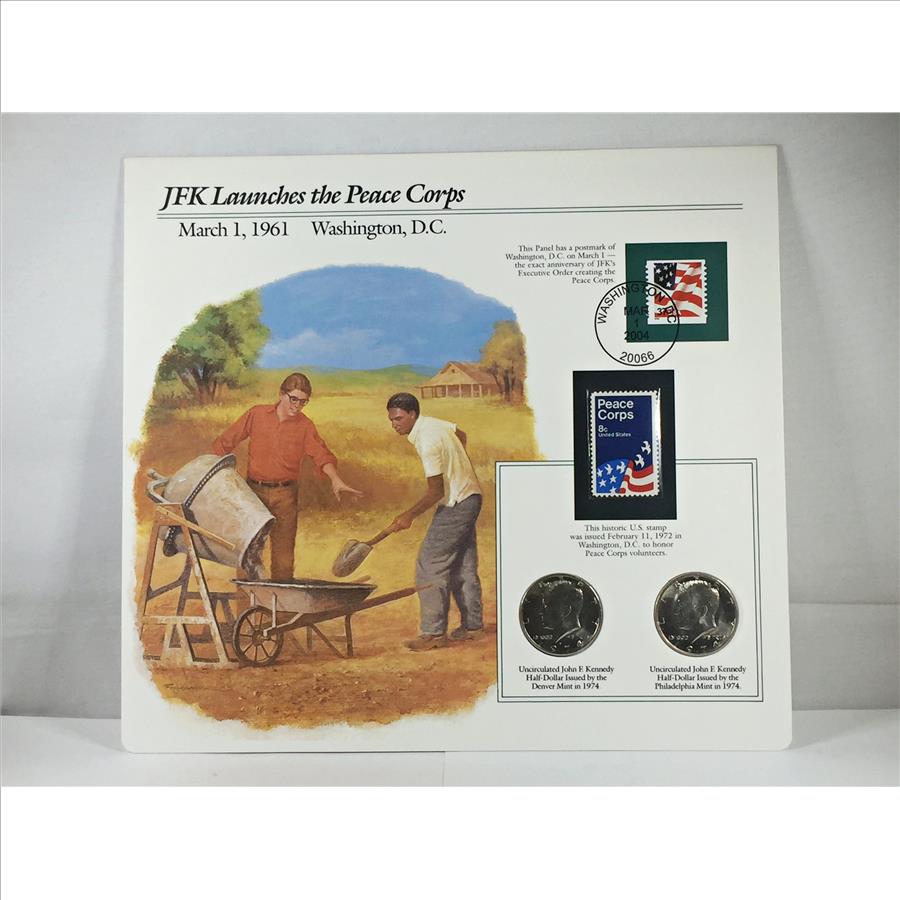 1974-D & P Kennedy Half Dollars & 2 Stamps*Encased in 9" x 10" Story Board Commemorating JFK Launches the Peace Corps