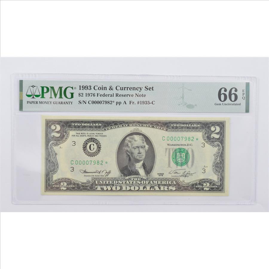 1976 $2 Federal Reserve Note FR# 1935-C* 1993 Coin & Currency Set PMG 66 EPQ GEM UNC