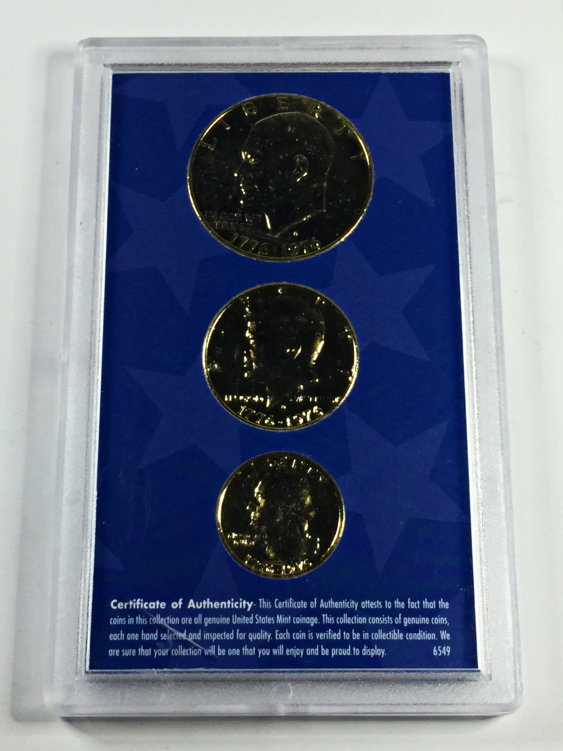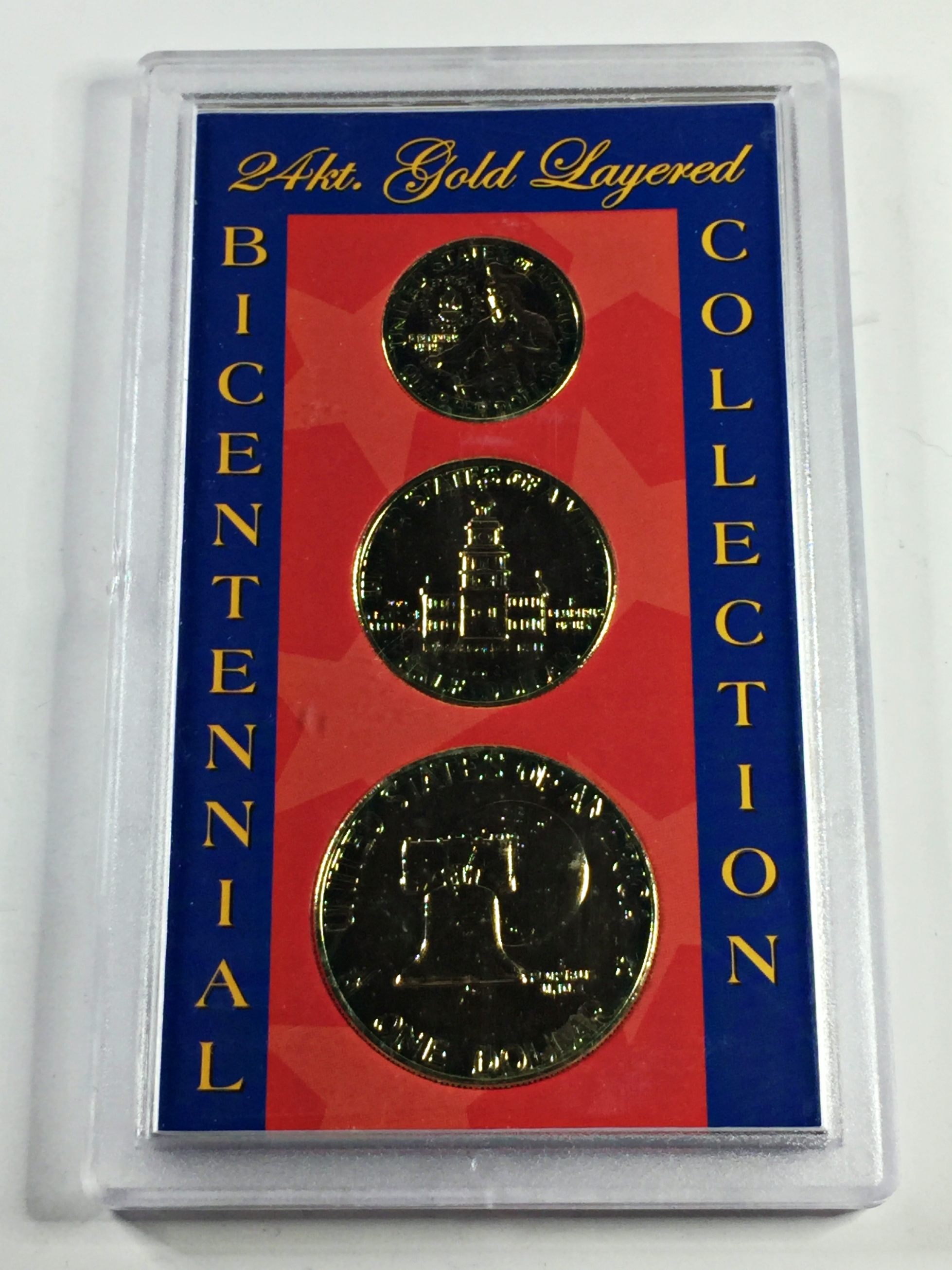 1976 24K Gold Layered US Bicentennial Coin Collection*Eisenhower Dollar, Kennedy Half Dollar and Washington Quarter