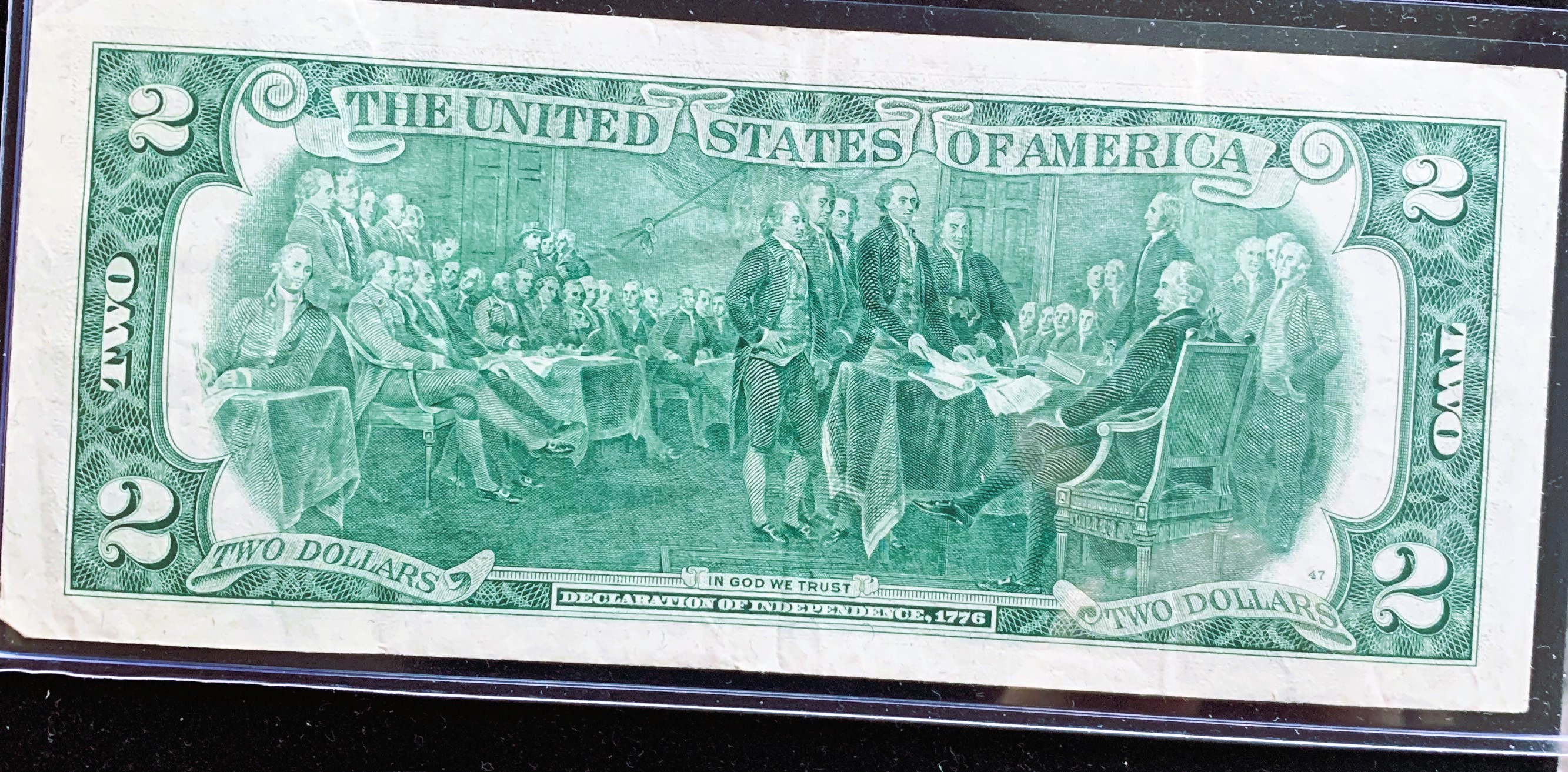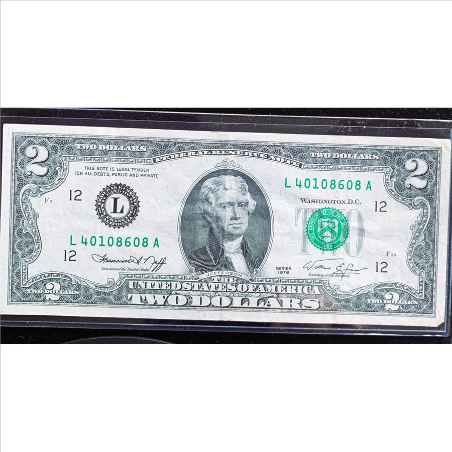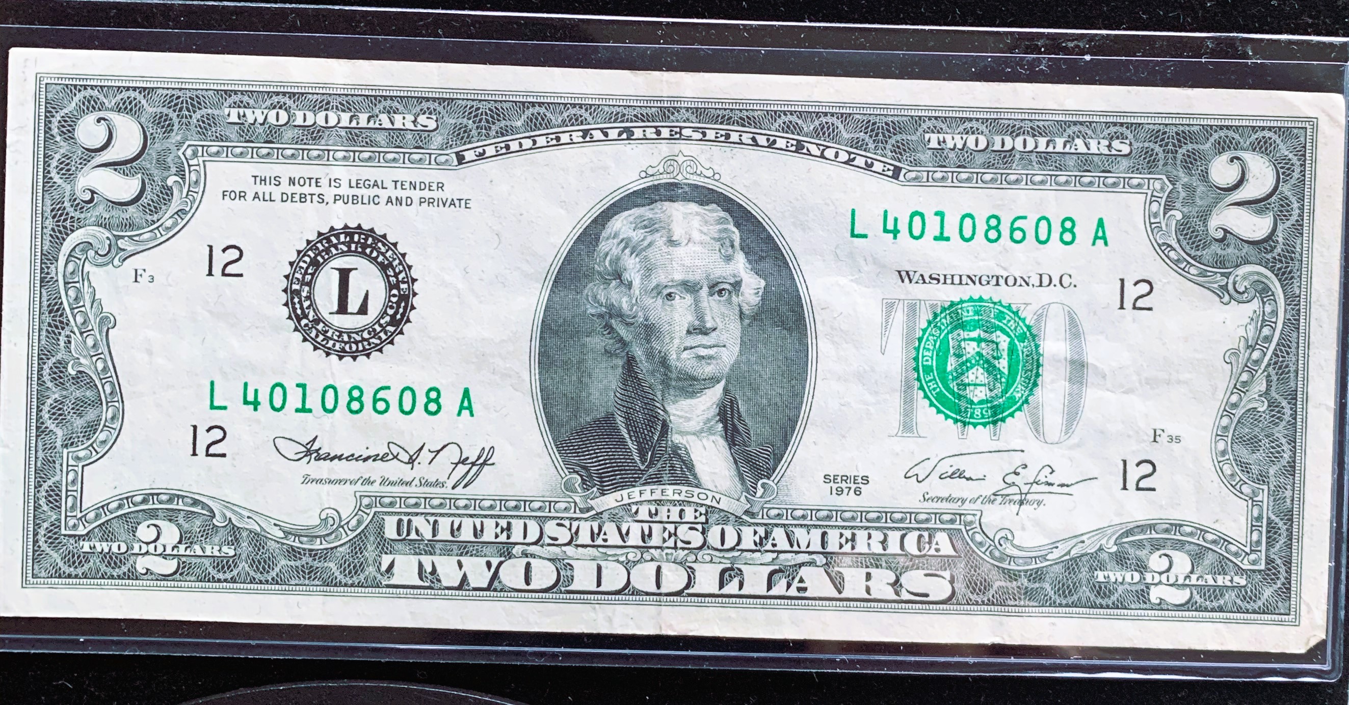 1976 SERIES $2 DOLLAR FEDERAL RESERVE NOTE, INTRODUCED IN CELEBRATION OF THE BICENTENNIAL OF INDEPENDENCE, GREEN SEAL, CRISP IN SLEVE