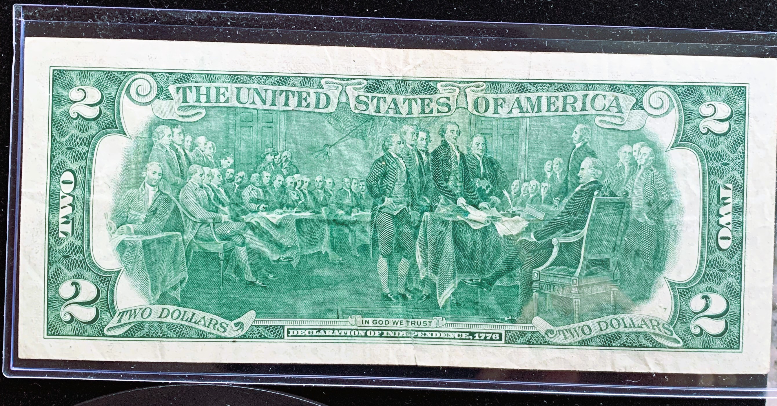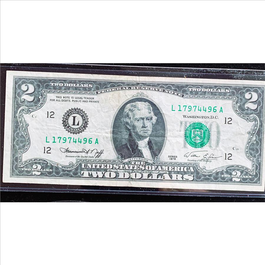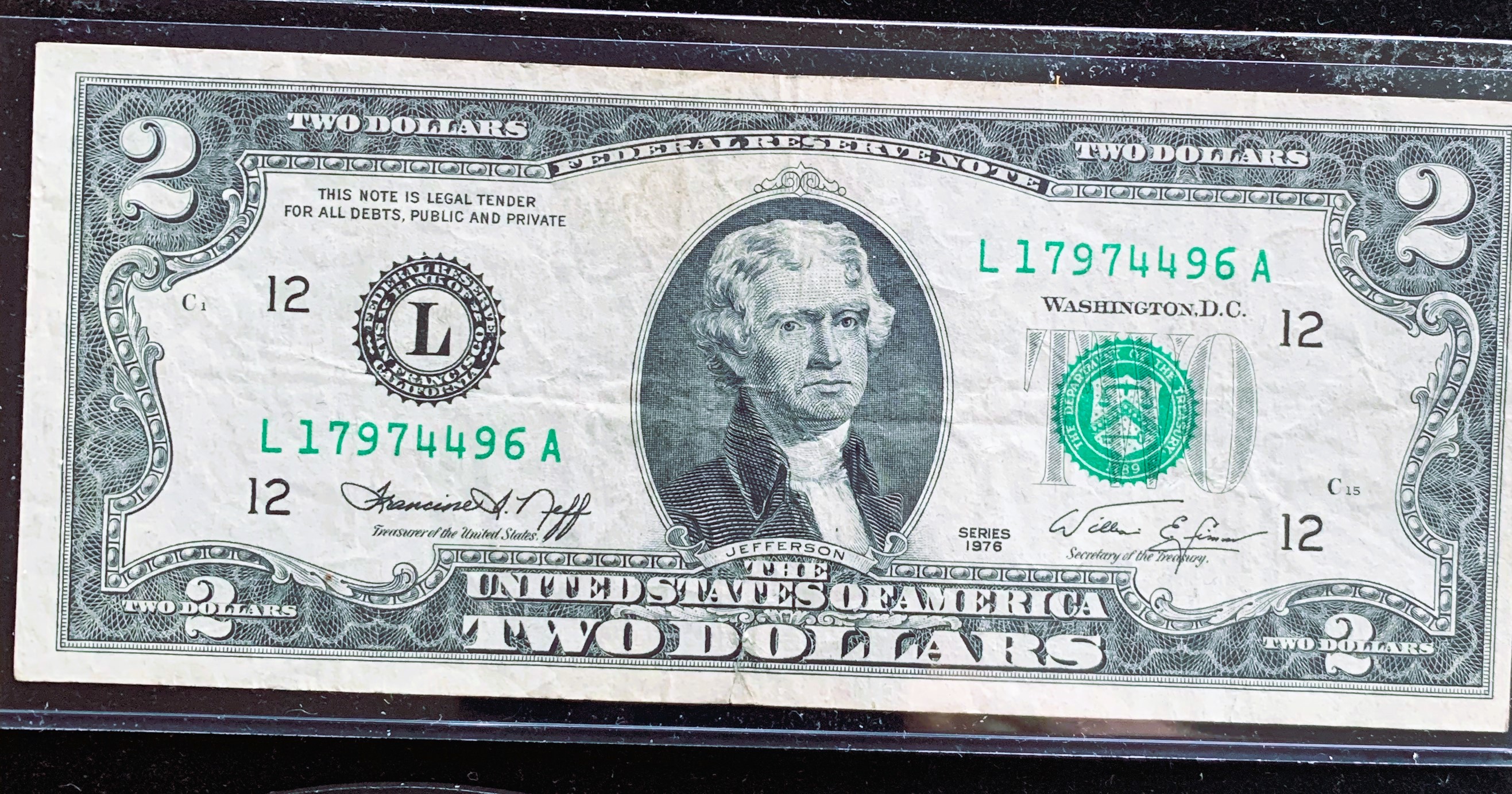 1976 SERIES $2 DOLLAR FEDERAL RESERVE NOTE, INTRODUCED IN CELEBRATION OF THE BICENTENNIAL OF INDEPENDENCE, GREEN SEAL, CRISP IN SLEVE