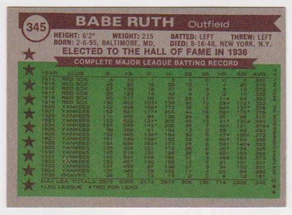 1976 Topps Babe Ruth #345 Card - HOF'er