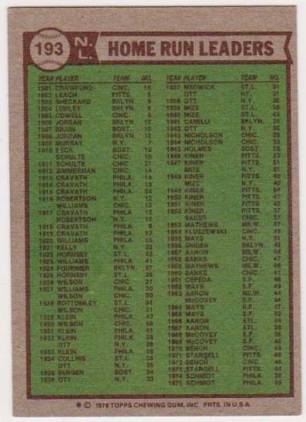 1976 Topps Mike Schmidt/Dave Kingman/Greg Luzinski #193 Card