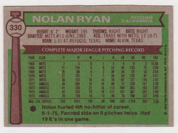 1976 Topps Nolan Ryan #330 Card - HOF'er