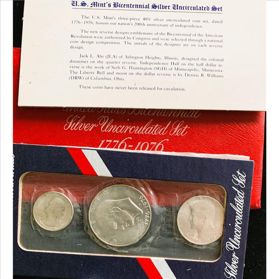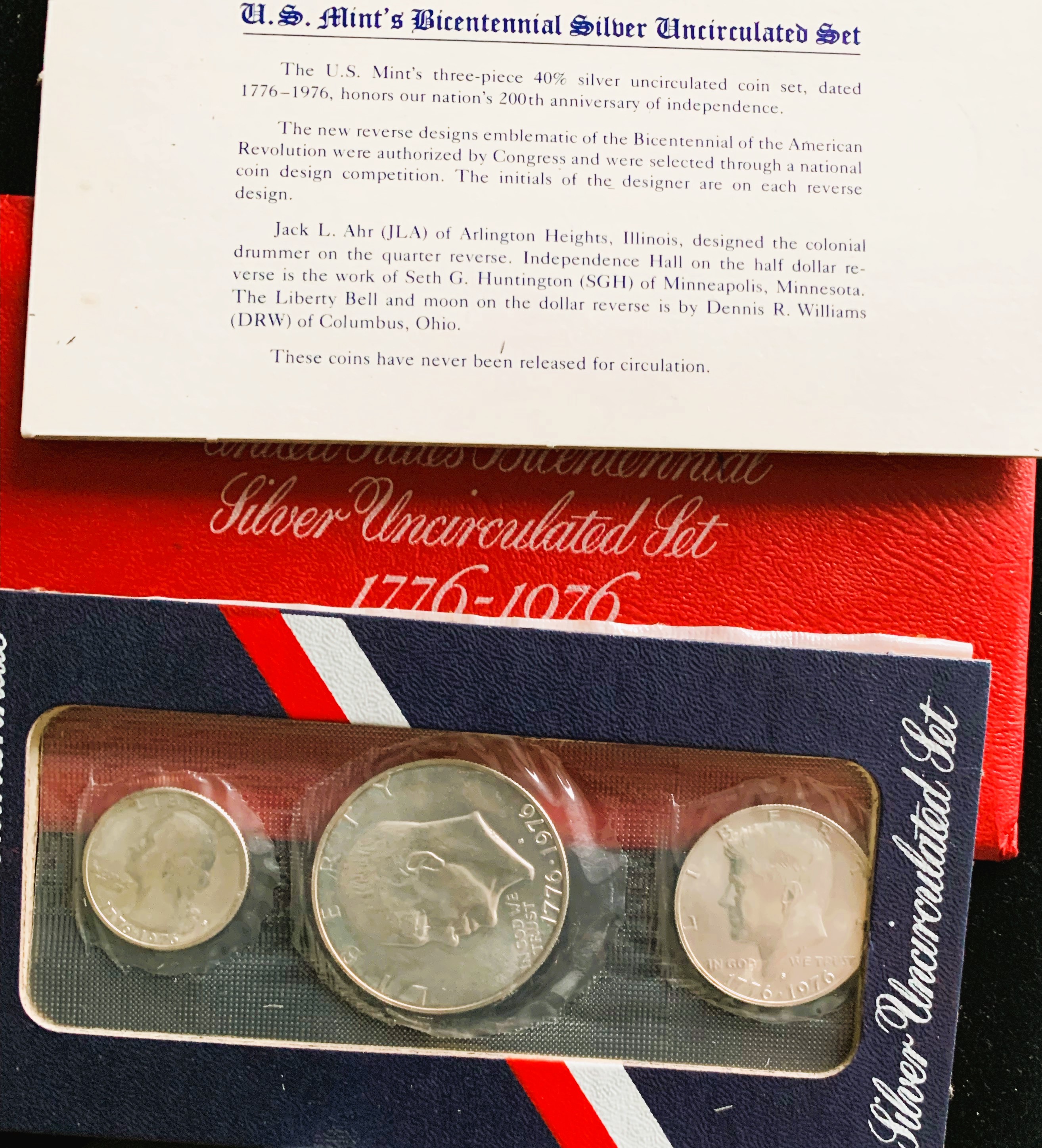 1976-S US BICENTENNIAL COMMEMORATIVE 3 COIN SET, SILVER UNCIRCULATED IN OGP, COA NEVER OPENED
