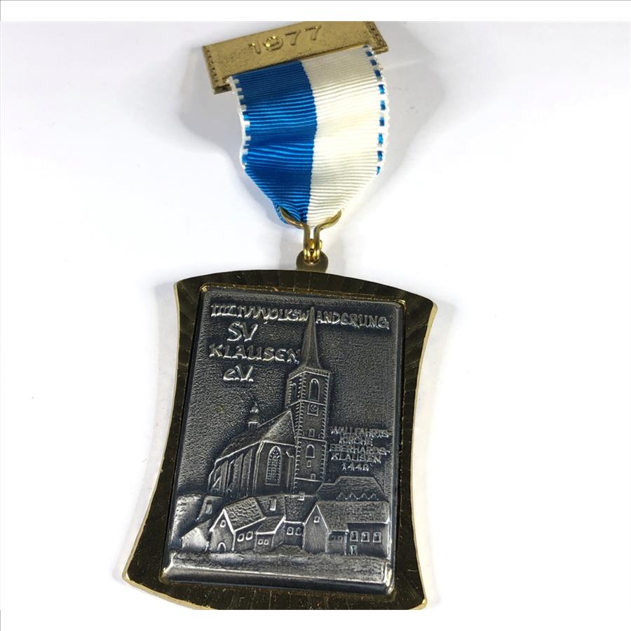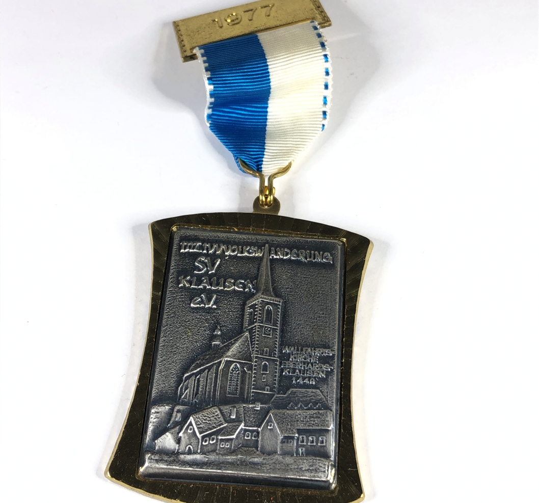 1977 German Hiking Marathon Medal Gilt and Pewter Blue and White Ribbon