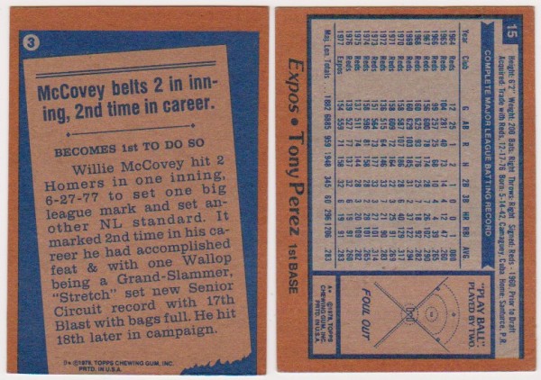 1978 Topps Willie McCovey #3 + Tony Perez #15 Card Pair - HOF'ers