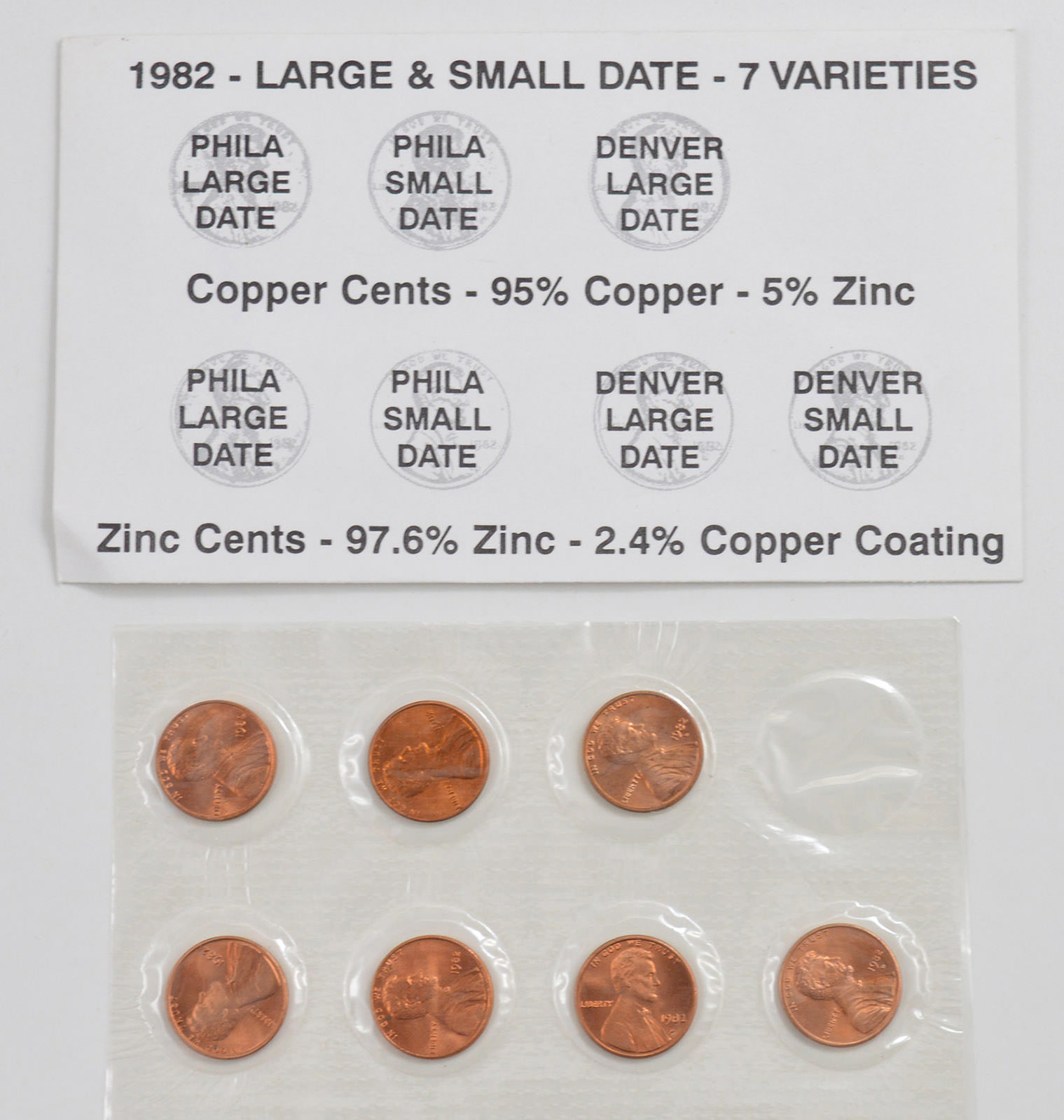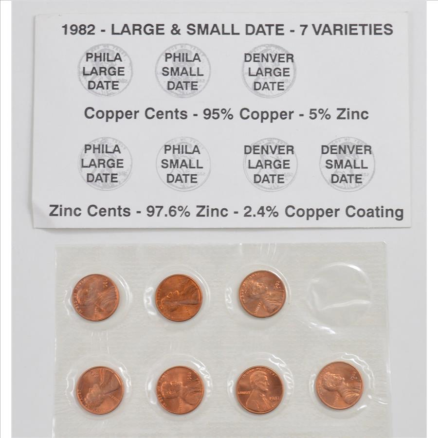 1982 - 7 VARIETY - Lincoln Cent Unc Set - Copper/Zinc P/D Small Date/Large - BU