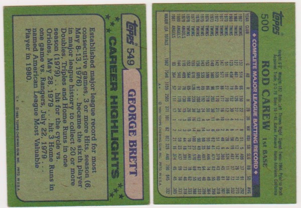 This is a 1982 Topps George Brett #549 and Rod Carew #500 card pair.  These are in approximately EX condition. They have light corner wear and are off center, but overall this is a nice pair of 44 year old cards of these two baseball Hall of Famers.