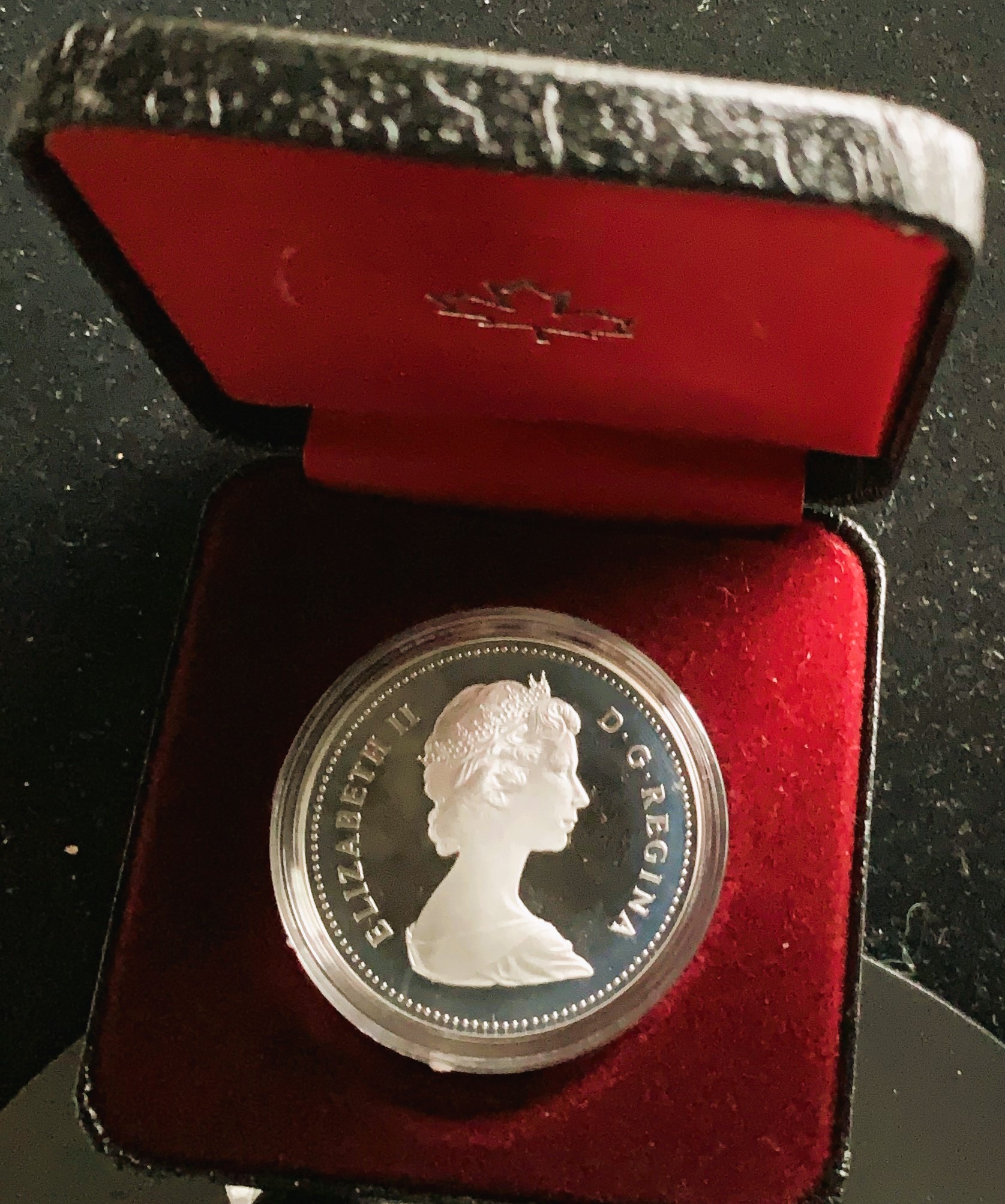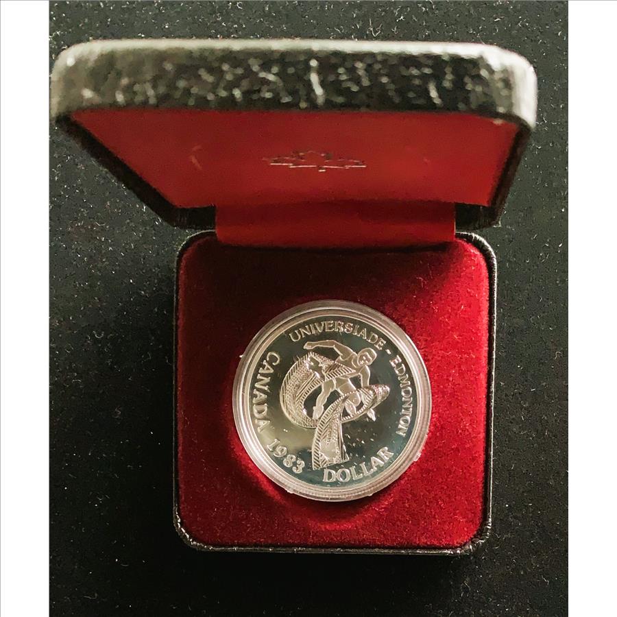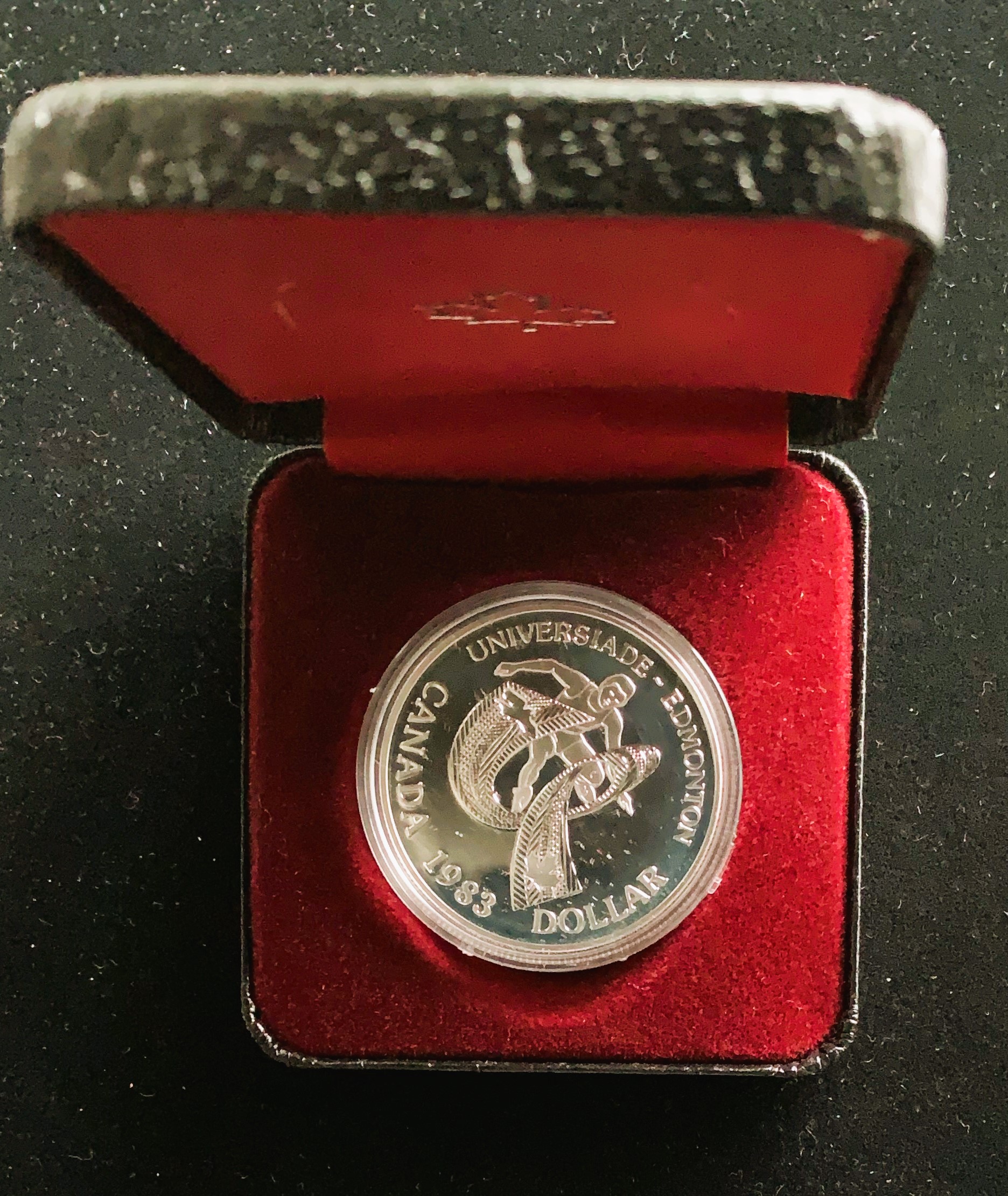 1983 CANADA EDMONTON UNIVERSIADE GAMES, $1 DOLLAR SILVER DCAM PROOF, LUSTROUS GEM COIN IN ORIG RCM CAPSULE/HOLDER